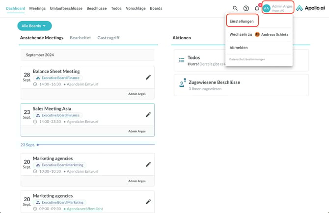 Klicken Sie auf Ihr Profilbild oben rechts, dann auf "Einstellungen":