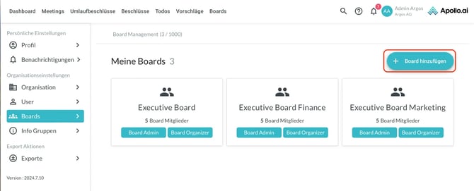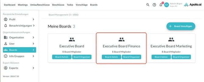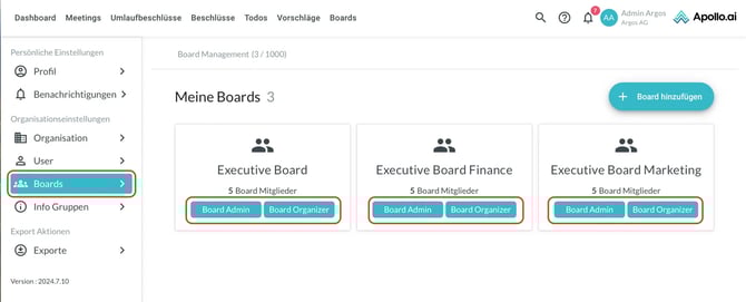 Navigieren Sie zu "Boards" über die linke Spalte. Auf der rechten Seite sehen Sie Ihre Boards und Ihre Rolle bzw. Rollen bei jedem Board: