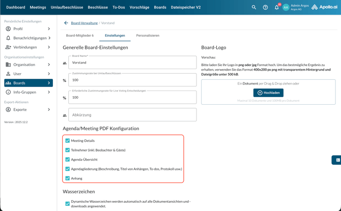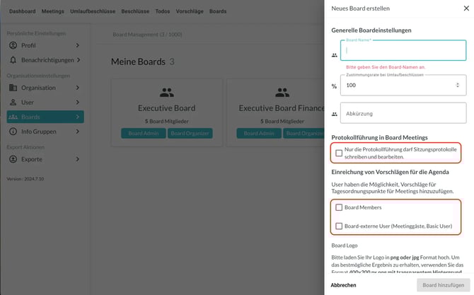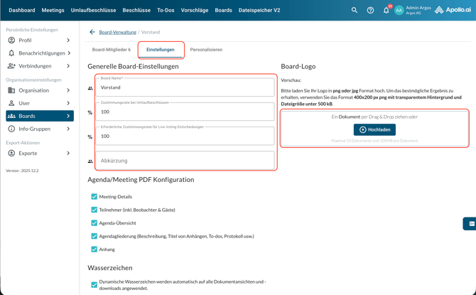 Im Tab „Einstellungen“ können Sie allgemeine Einstellungen ändern, wie z.B. den Board-Namen, die Zustimmungsrate für Umlaufbeschlüsse und das Board-Logo: