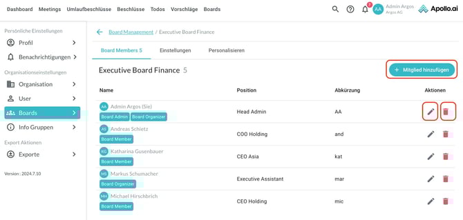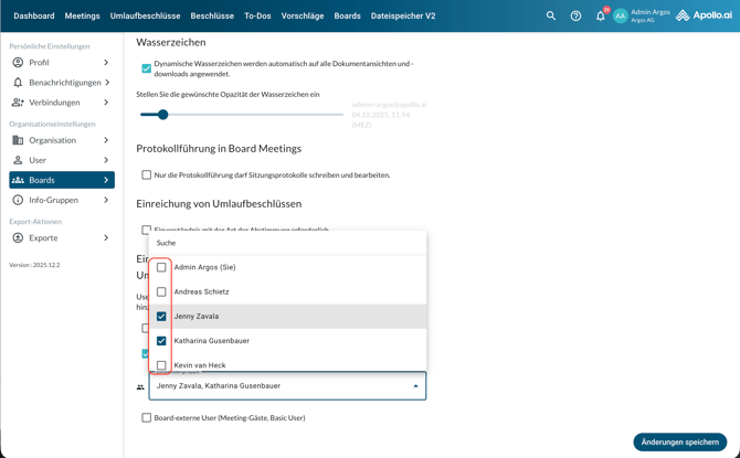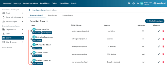 Sie können die bestehenden Board-Mitglieder auch per Drag & Drop nach Wunsch sortieren. Die neue Reihenfolge wird in allen Teilnehmerlisten für Sitzungen und Umlaufbeschlüsse übernommen: