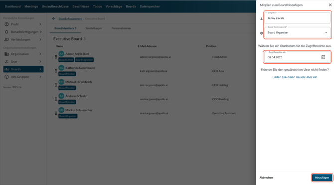 Wenn Sie ein neues Mitglied hinzufügen, müssen Sie zuerst sicherstellen, dass es sich um einen bestehenden Apollo.ai Anwender handelt. Wählen Sie einen User aus der Liste aus, selektieren Sie die nötigen Berechtigungen sowie das Startdatum für die Zugriffsrechte und klicken Sie unten rechts auf "Hinzufügen":