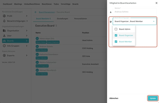 Wenn Sie bei einem Board-Mitglied auf das Bearbeitungssymbol auf der rechten Seite klicken, können Sie die Berechtigungen vom ausgewählten Anwender anpassen. Klicken Sie im Anschluss auf "Update" unten rechts: