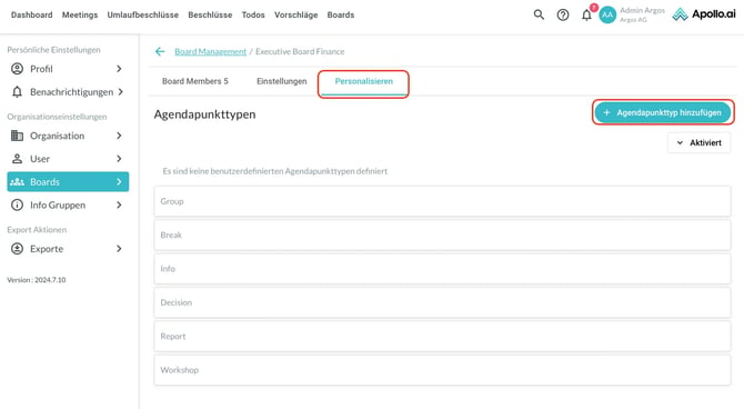 Unter "Personalisieren" können Sie benutzerdefinierte Agendapunkttypen erstellen: