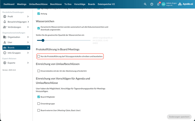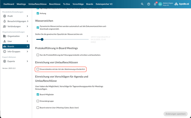 Unter „Einreichung von Umlaufbeschlüssen“ können Sie festlegen, ob das ausgewählte Board dem einstufigen Genehmigungsprozess für Umlaufbeschlüsse (Kästchen deaktivieren) oder dem zweistufigen Genehmigungsprozess folgen soll (Kästchen aktivieren):