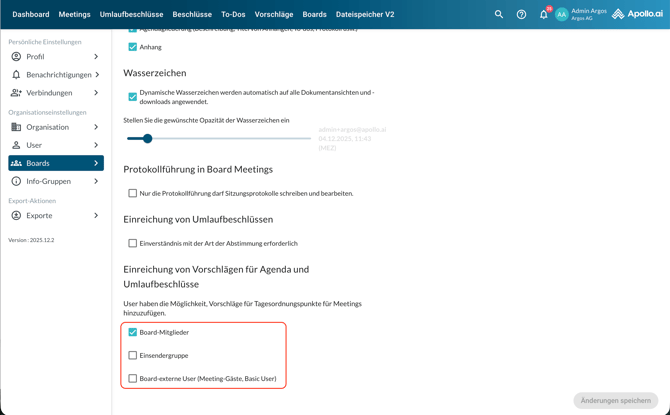 Sie können auch als Standardeinstellung entscheiden, wer Vorschläge für die Agenda einreichen darf. Wenn Sie bei der Boarderstellung diese Optionen nicht anhaken, können Sie später trotzdem für einzelne Agenden Vorschläge einfordern: