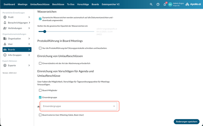Weiter unten können Sie festlegen, wer berechtigt sein soll, Tagesordnungspunkte und Umlaufbeschlüsse vorzuschlagen: nur Board-Mitglieder, eine vordefinierte Gruppe von Einsendern (eine Professional Subscription ist für diese Option erforderlich) oder auch externe Nutzer: