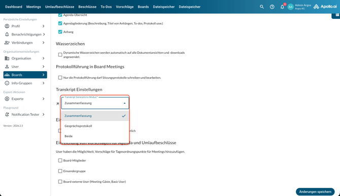 Unter „Transkript-Einstellungen“ (Transkript-Add-on erforderlich) können Sie festlegen, ob die KI-Meeting-Transkriptausgabe eine Zusammenfassung oder ein Gesprächsprotokoll sein soll: