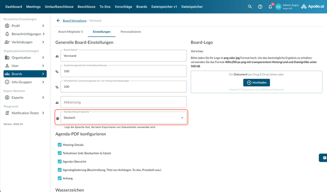 Die "Standard Board-Sprache" definiert die Sprache aller systemgenerierten Dokumente und zwar Agenda-PDF, Protokoll-PDF, Review-PDF und Umlaufbeschluss-PDF: