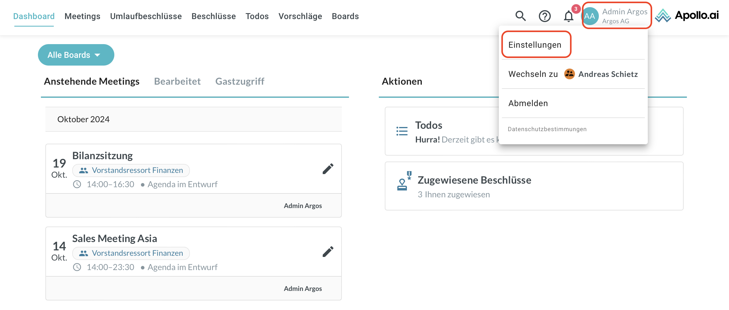 Klicken Sie auf Ihr Profilbild oben rechts, dann auf "Einstellungen":