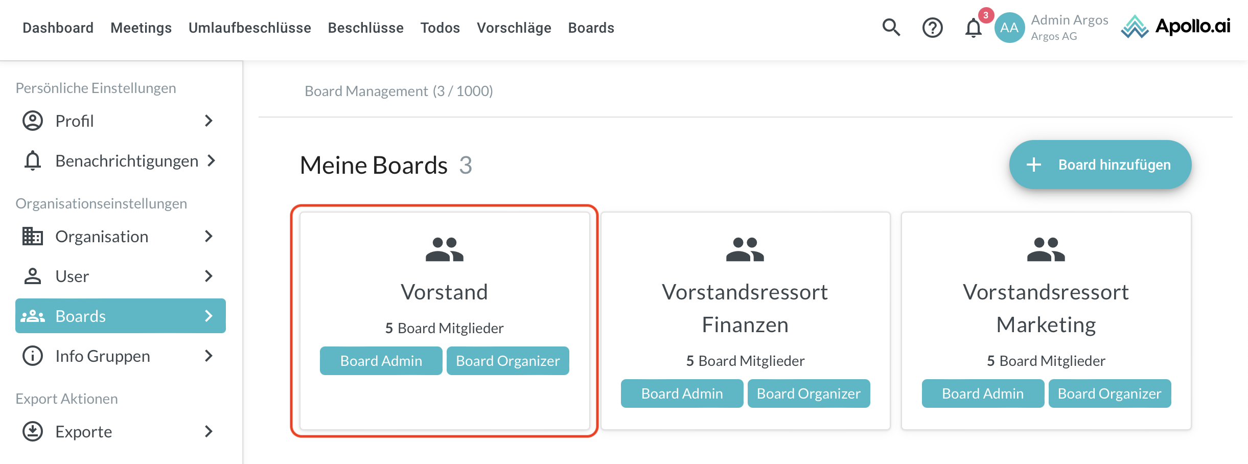 Navigieren Sie zu "Boards" über die linke Spalte, dann klicken Sie auf das Board, für das Sie die Wasserzeichenoption aktivieren möchten: