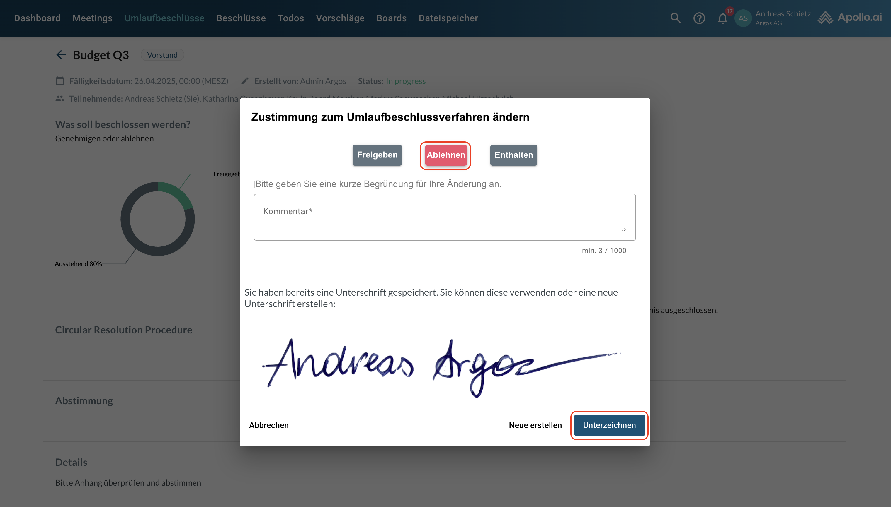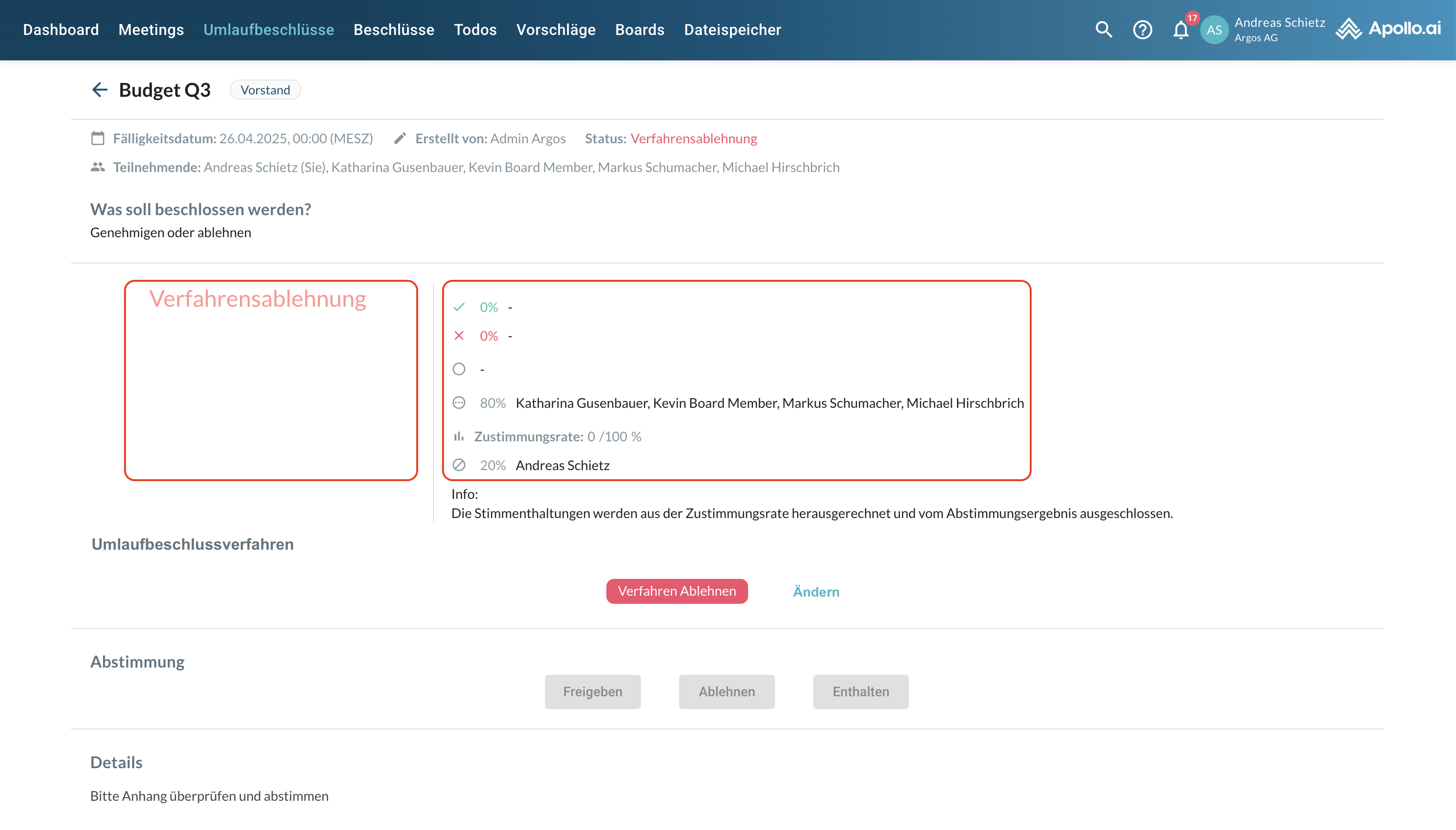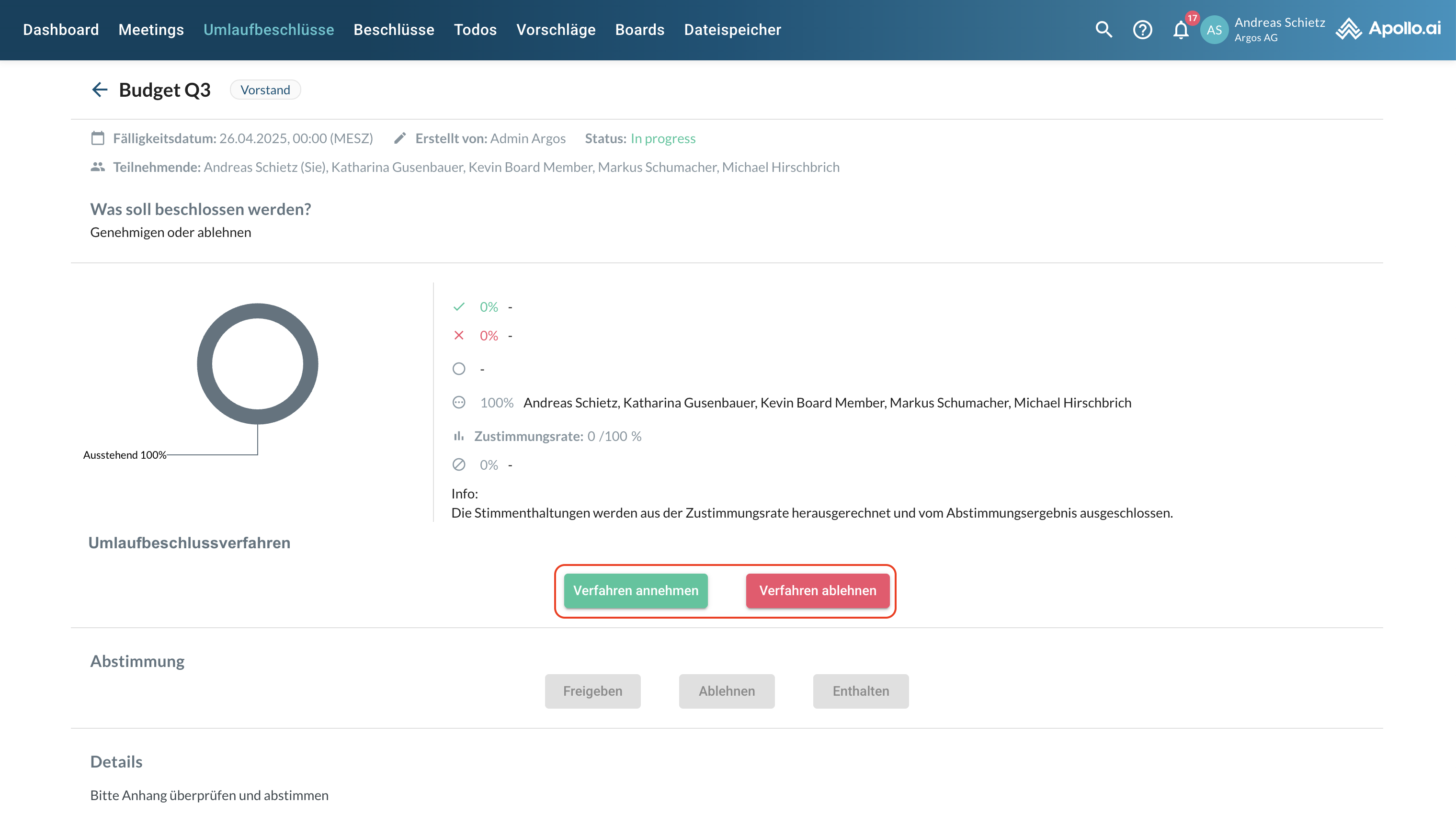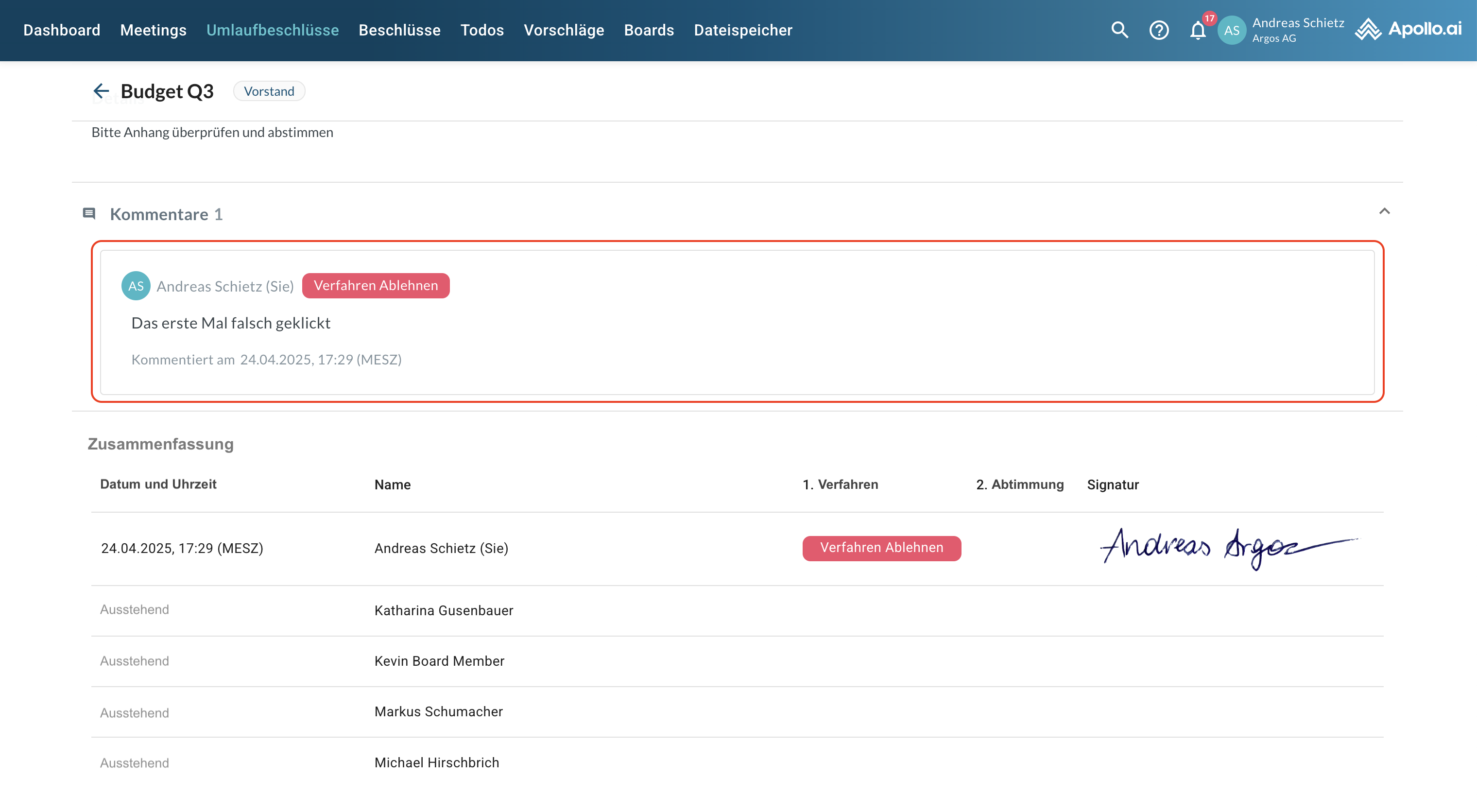 Wenn Sie dem Verfahren widersprechen, ist der Umlaufbeschlussprozess für Sie abgeschlossen. Das Kreisdiagramm zum Abstimmungsfortschritt wird nicht angezeigt; Sie können jedoch weiterhin die Stimmen der anderen Board‑Mitglieder auf der rechten Seite sehen:
