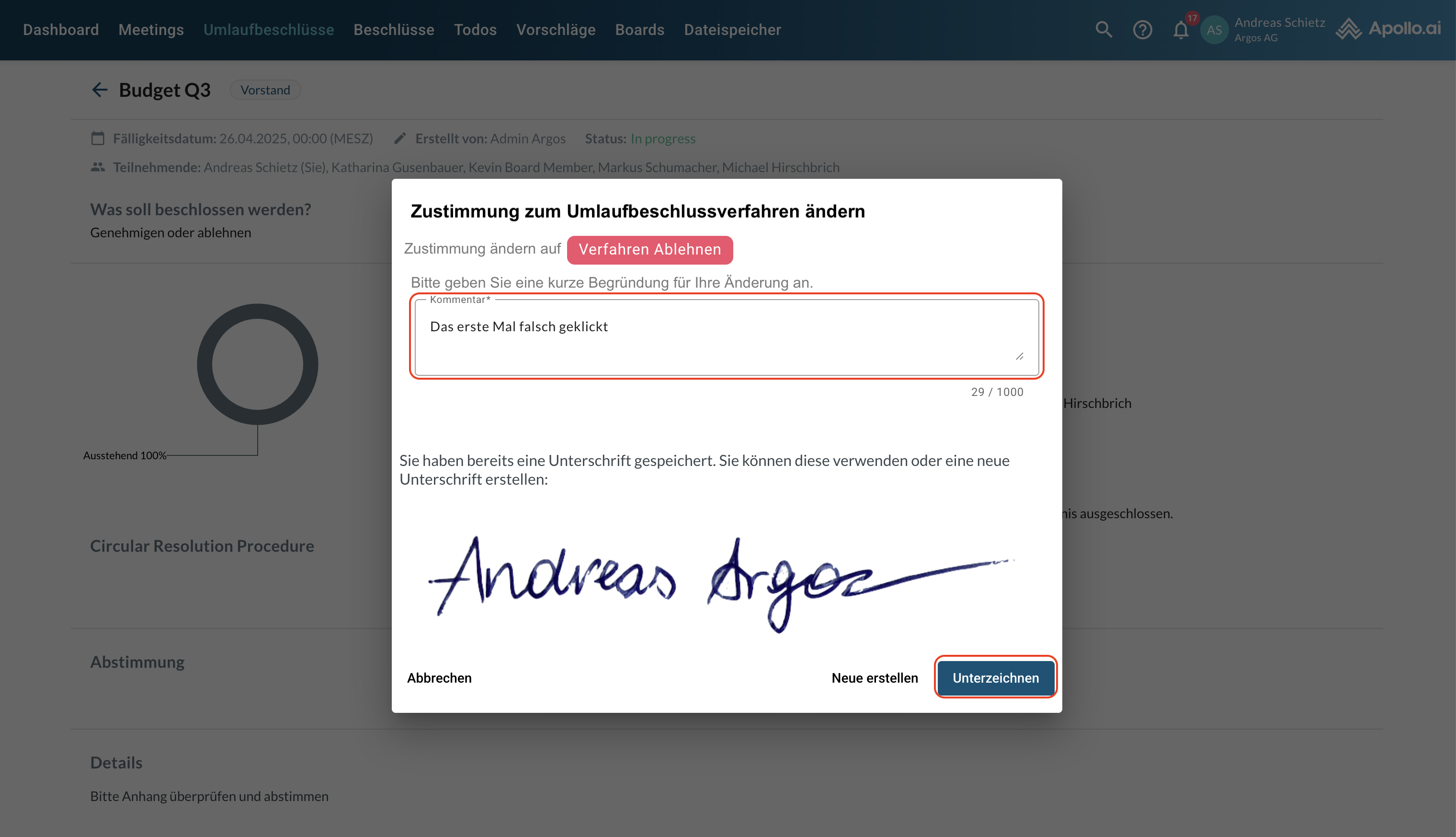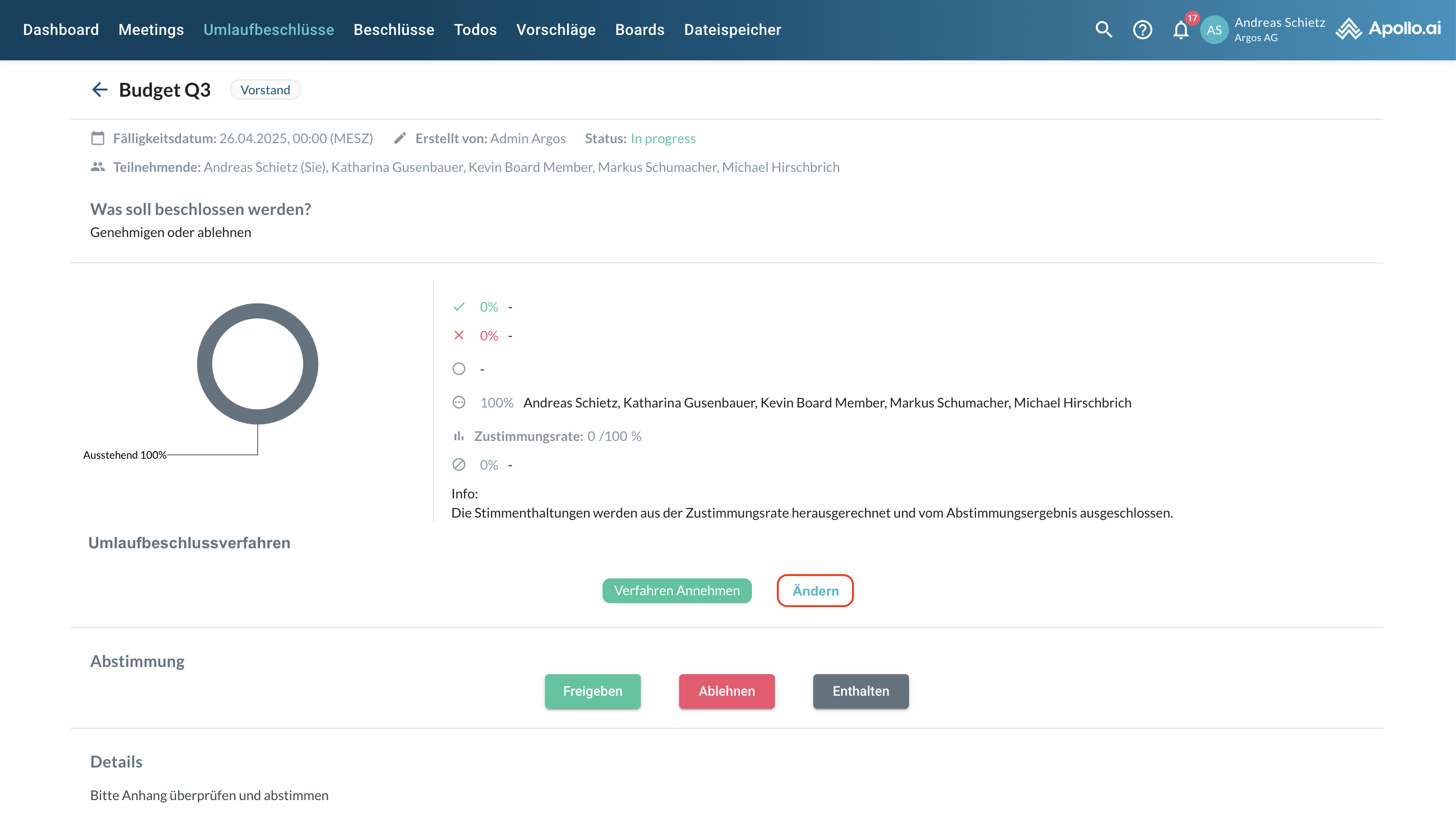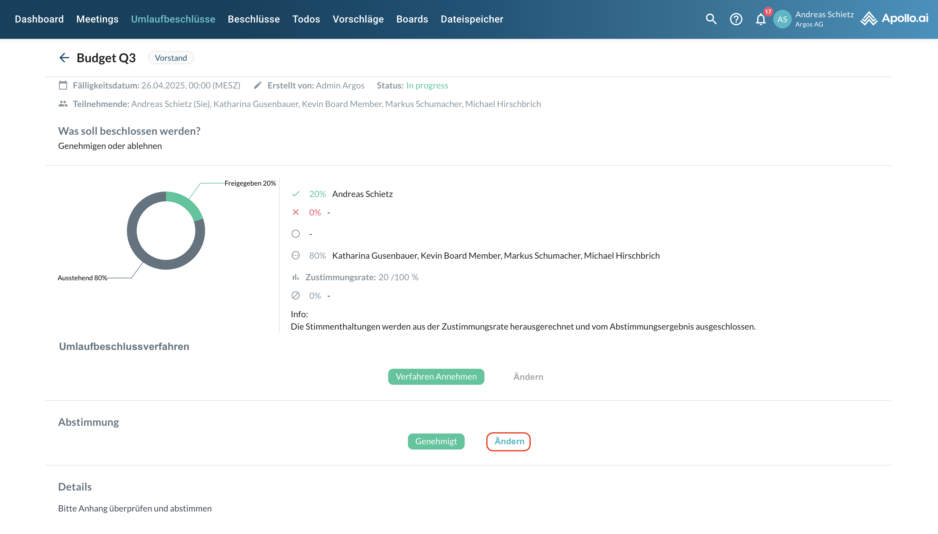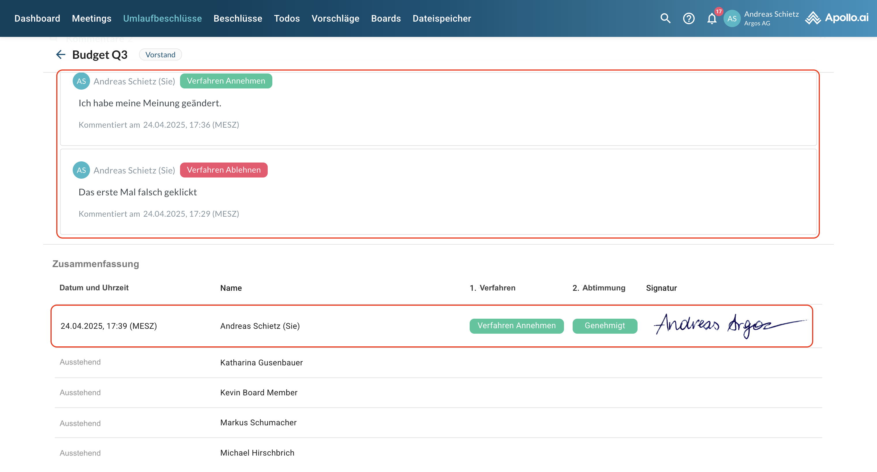 Nachdem Sie über den Inhalt vom Umlaufbeschluss abgestimmt haben, können Sie Ihre Stimme bei Bedarf auf eine andere Option ändern. Allerdings können Sie Ihre Zustimmung zum Verfahren nicht mehr ändern: