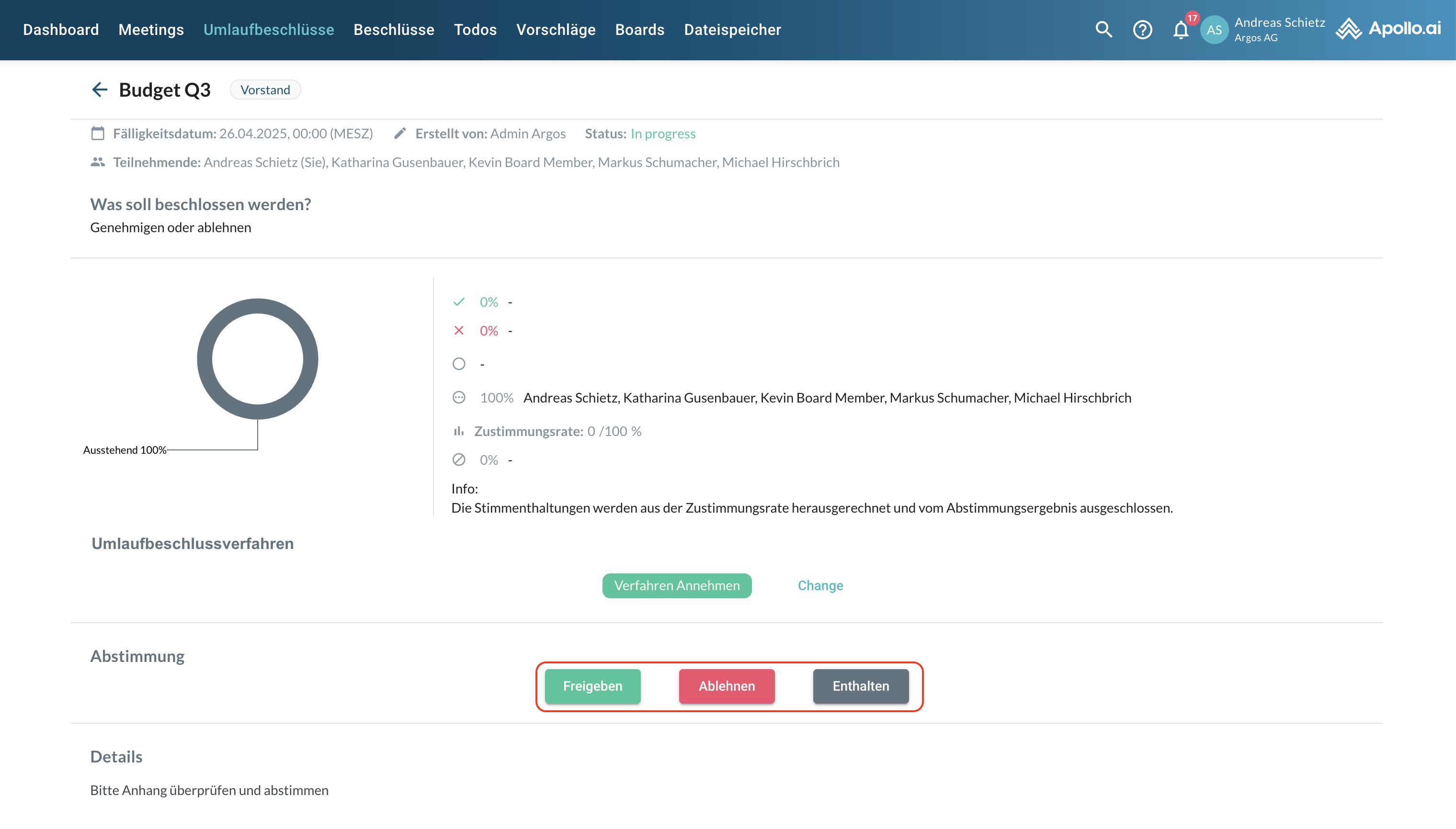 Alle zugehörigen Informationen sowie angehängte Dokumente werden auf der folgenden Seite angezeigt, ebenso der Echtzeit‑Fortschritt der Abstimmung.