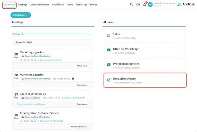 Wenn Sie als Manager die Aufforderung erhalten, an einem Umlaufbeschluss teilzunehmen, ist das ein schneller und einfacher Weg, Entscheidungen zu treffen, die keiner Besprechung bedürfen. Die Umlaufbeschlüsse sind vom Idealfall mit allen Informationen gefüllt und es liegt an Ihnen, abzustimmen. Klicken Sie dafür auf die Aktionskarte "Umlaufbeschlüsse" in Ihrem Dashboard: