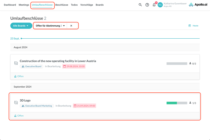 Sie werden zum Tab "Umlaufbeschlüsse" umgeleitet, wo die Entscheidungen nach "Offen für Abstimmung" gefiltert sind. Klicken Sie auf die gewünschte Entscheidung: