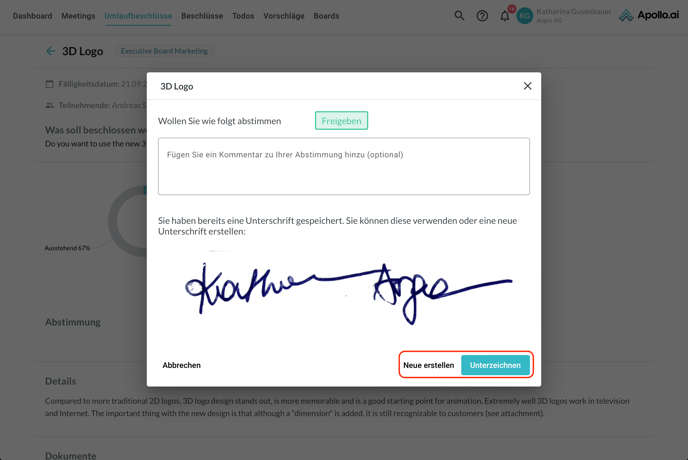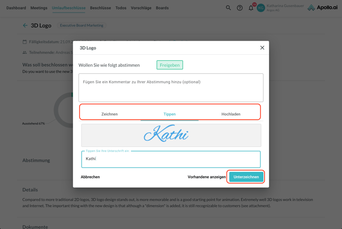 Danach werden Sie aufgefordert, die Wahl zu bestätigen und evtl. Ihre Signatur unter den Umlaufbeschluss zu setzten: