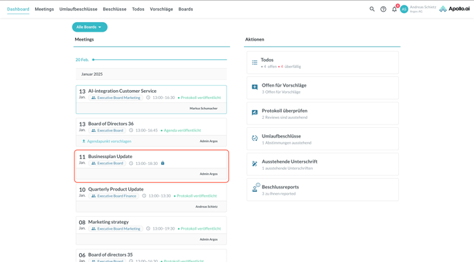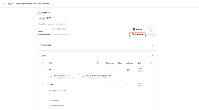 Um alle Tagesordnungspunkte und Anhänge zur Sitzung in einem einzigen PDF-Dokument anzuzeigen, klicken Sie oben rechts auf „Board Book“ (dieser Button ist nur sichtbar, wenn der Board Organizer die Sitzungsmappe erstellt hat):