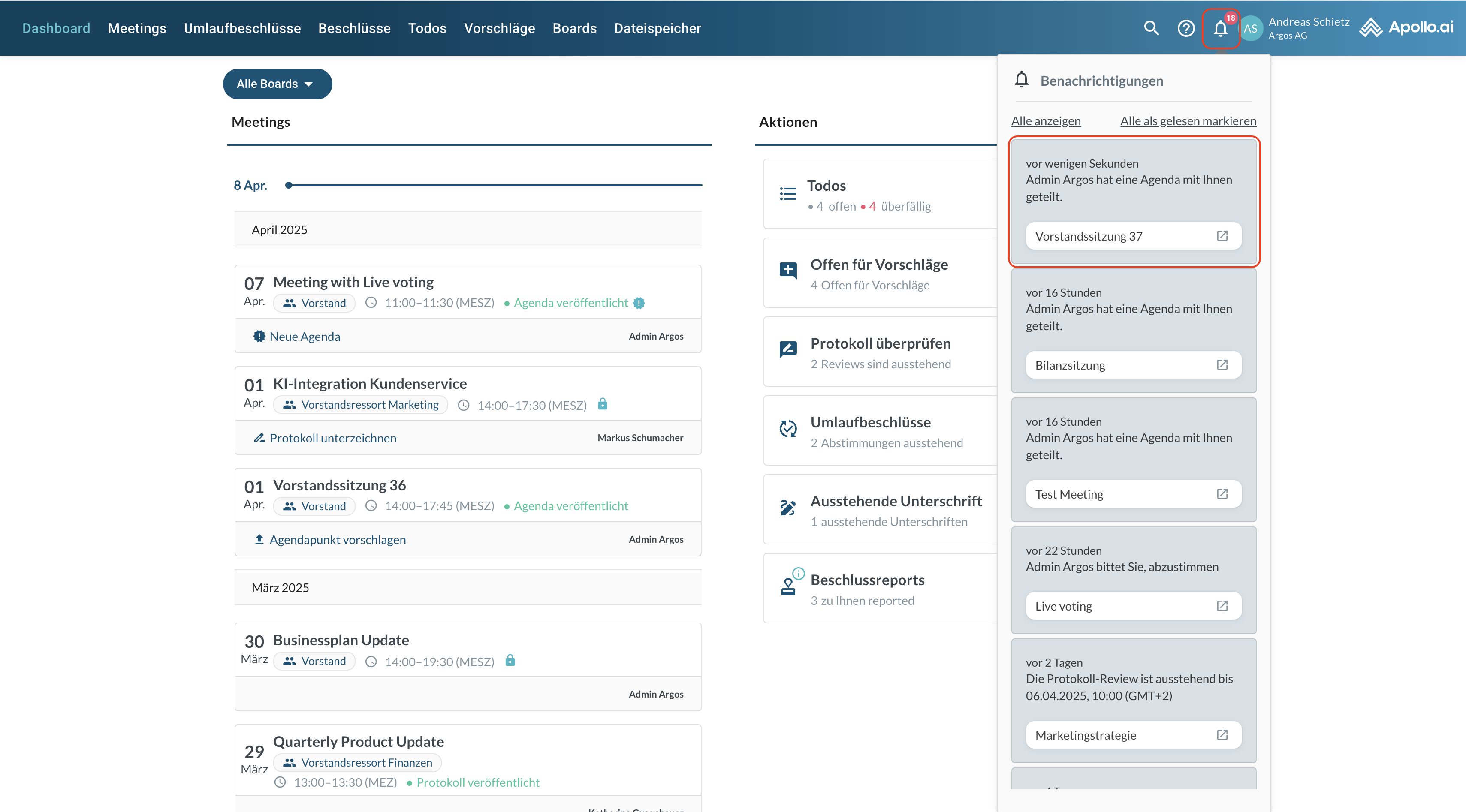 Wenn ein Board Organizer um Feedback zur Agenda bittet, werden Sie automatisch benachrichtigt: