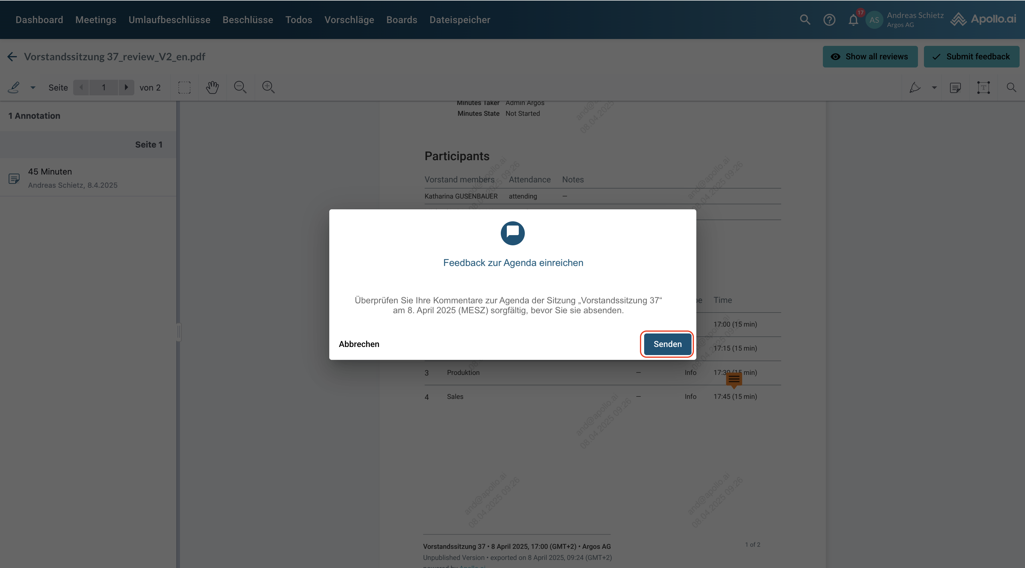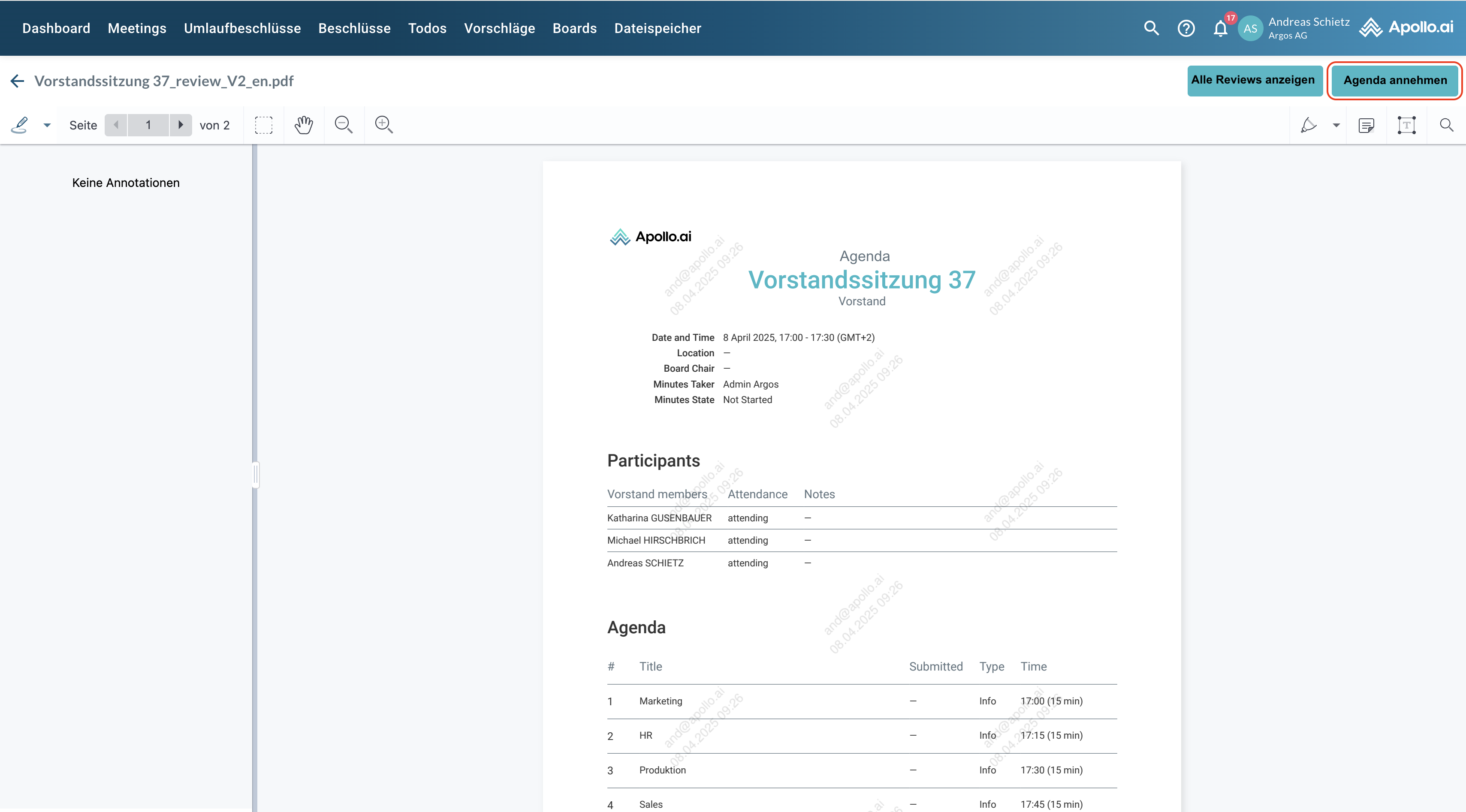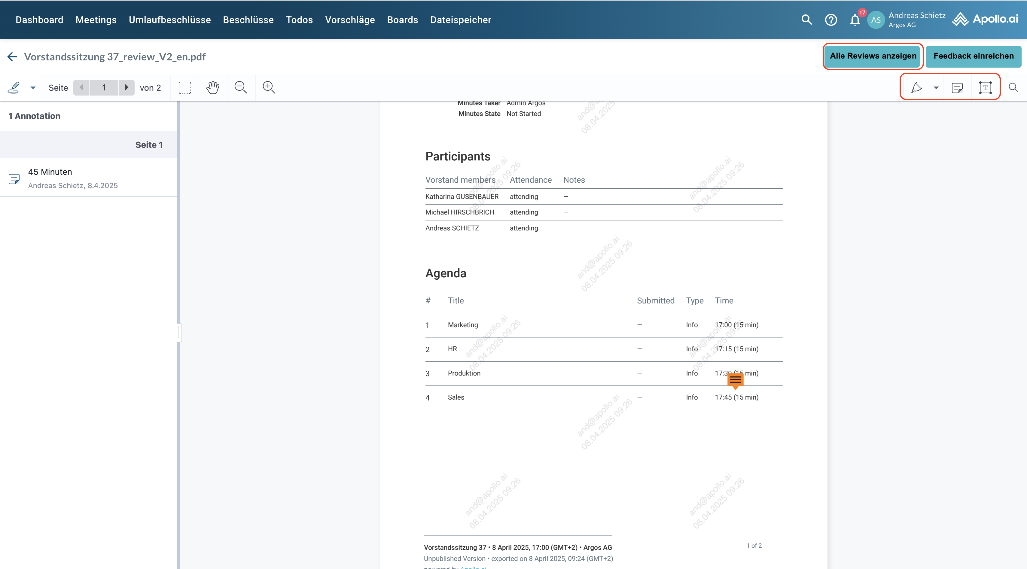 Klicken Sie auf die Benachrichtigung, um zur Agenda im PDF-Viewer weitergeleitet zu werden. Verwenden Sie die Toolbox, um Ihre Kommentare hinzuzufügen und klicken Sie auf „Alle Reviews anzeigen“, um die Kommentare anderer Board-Mitglieder anzusehen (sofern vorhanden):