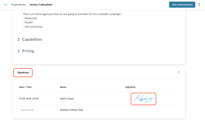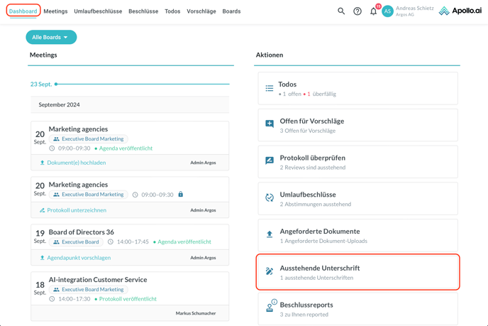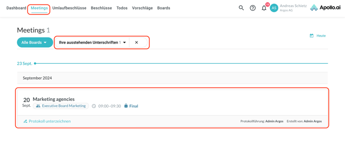 Sie werden zum Tab "Meetings" umgeleitet. Diese sind nach "Ihre ausstehenden Unterschriften" gefiltert. Wählen Sie ein Meeting aus der Liste aus: