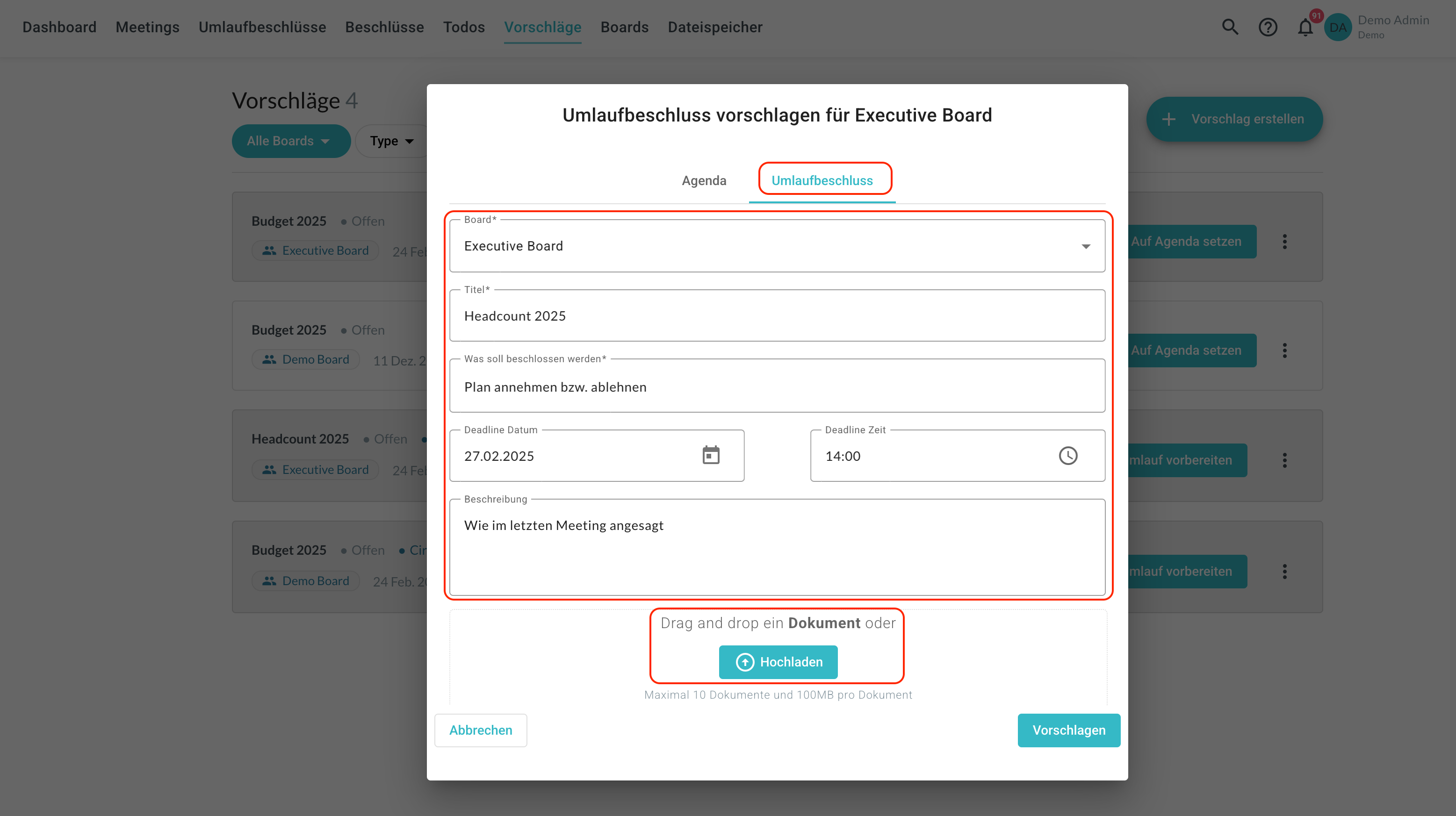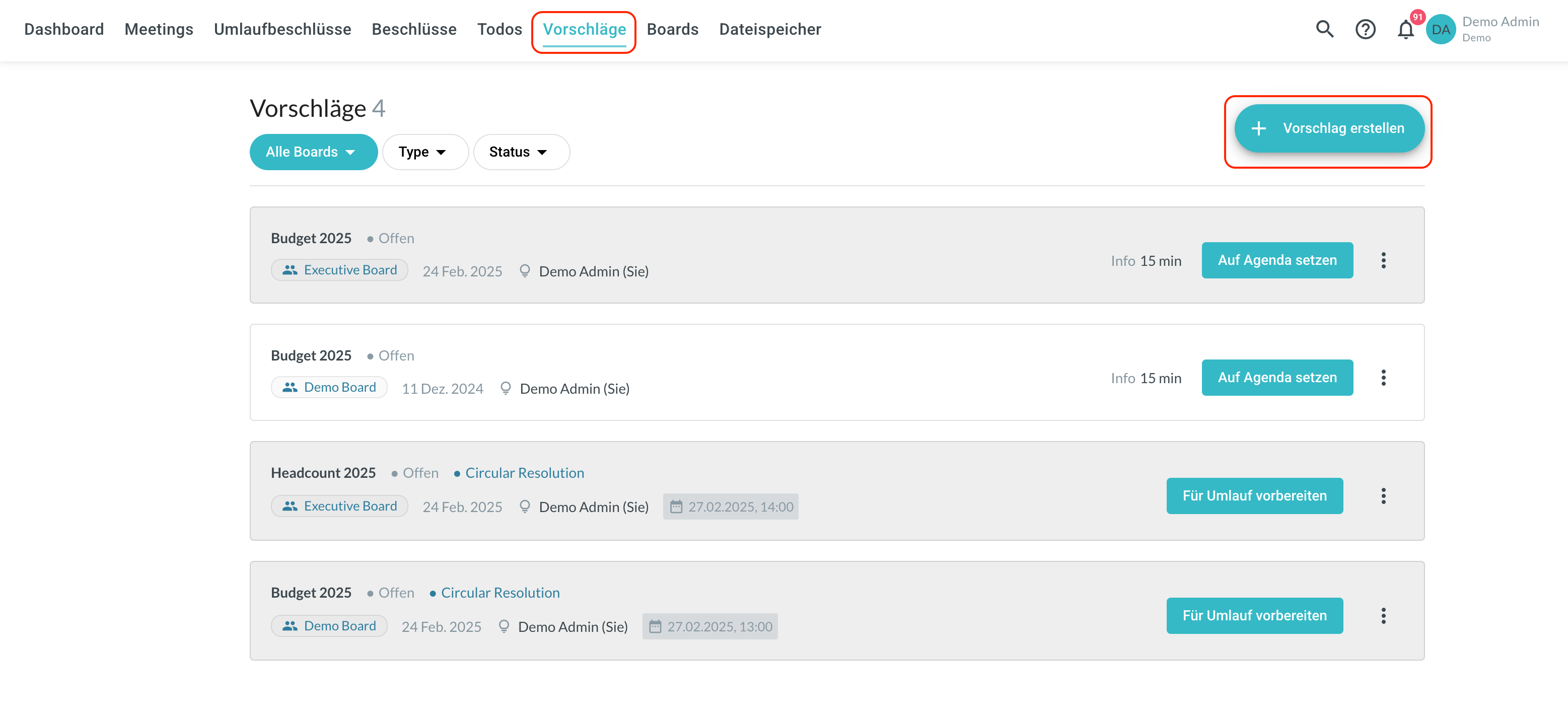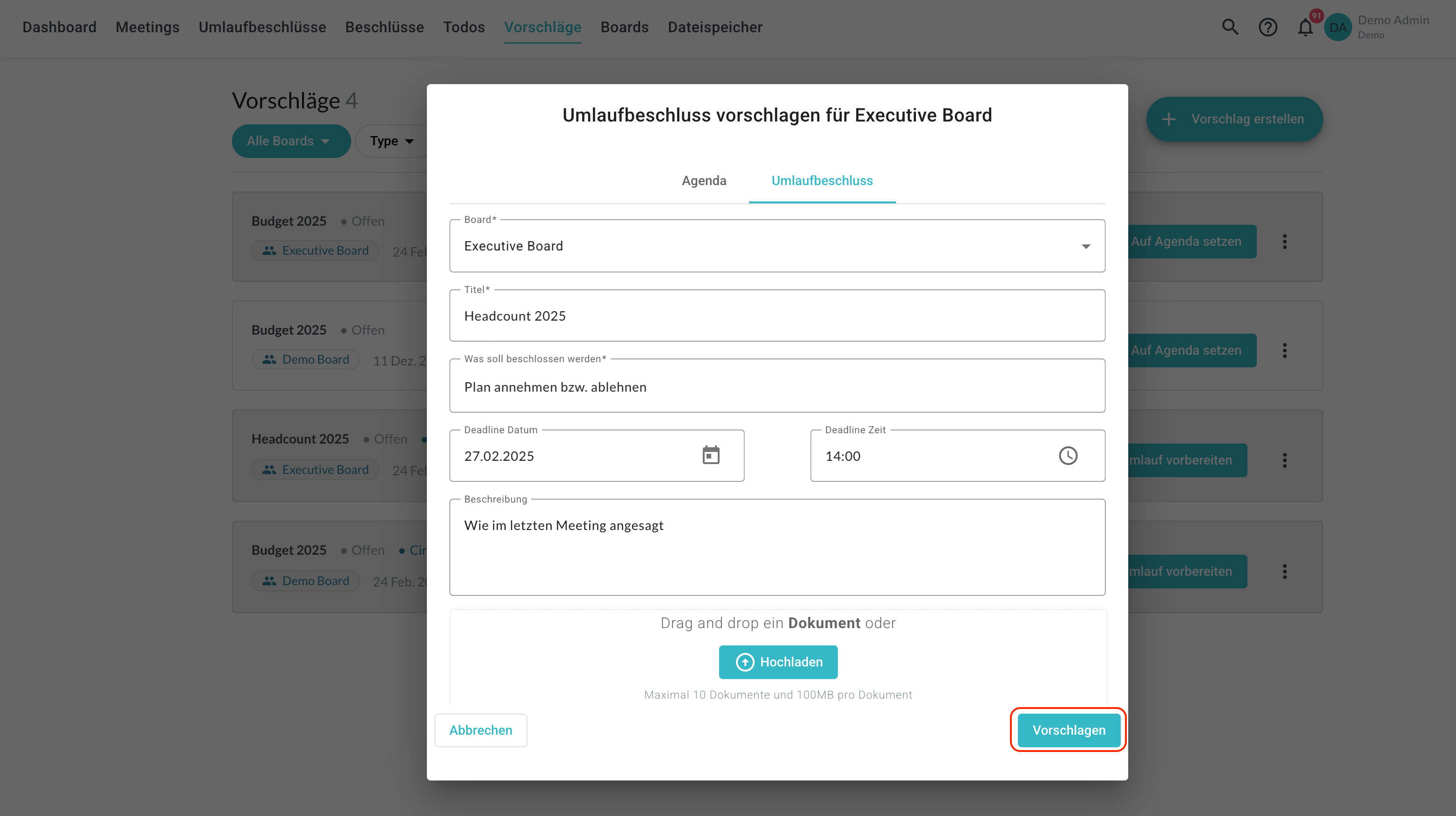 Die Board Organizers werden automatisch über Ihren Vorschlag informiert und können den Abstimmungsprozess starten.