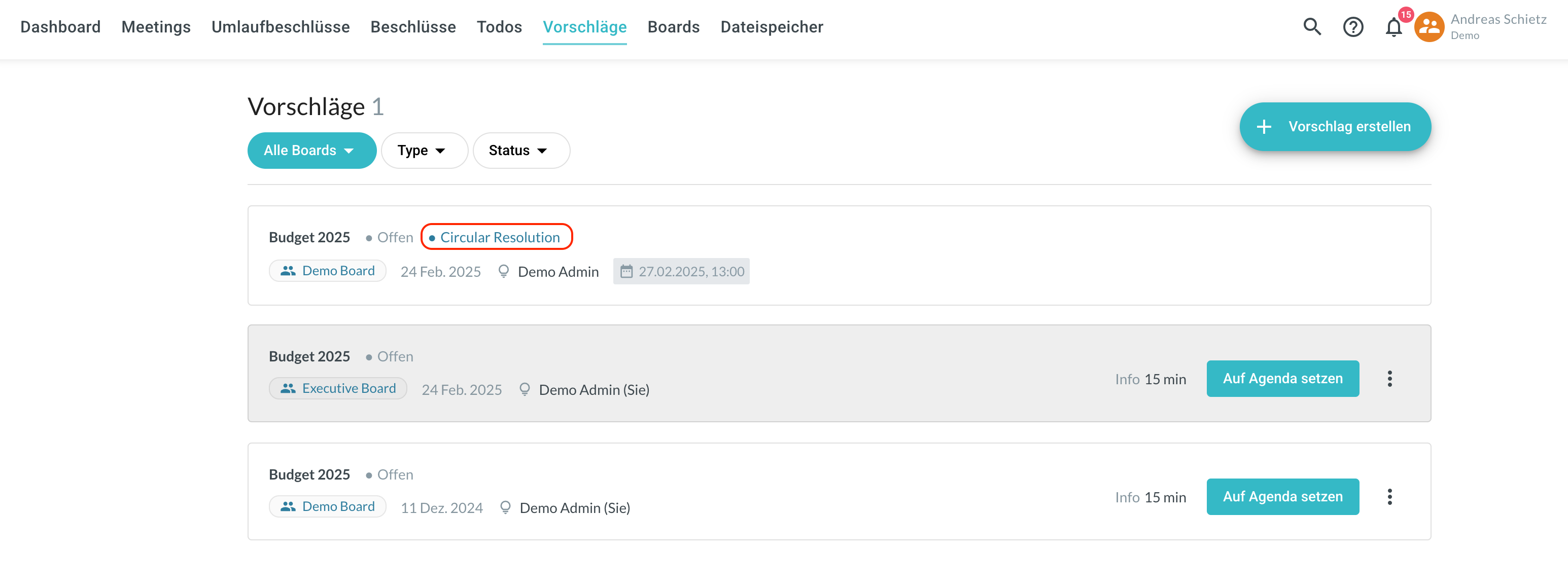 In der Übersicht im Reiter „Vorschläge“ sind Umlaufbeschlussvorschläge entsprechend gekennzeichnet, um sie von Vorschlägen zur Agenda zu unterscheiden: