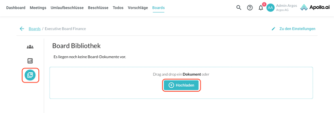 Navigieren Sie zur Board Bibliothek über die linke Spalte, dann fügen Sie ein Dokument über Drag & Drop bzw. über die Taste "Hochladen" hinzu: