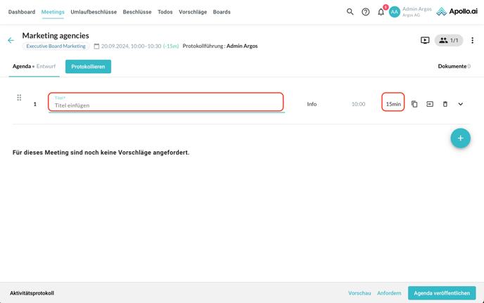 Über die Optionen im unteren Bereich haben Sie die Möglichkeit, Dokumente hochzuladen bzw. anzufordern, Gäste hinzuzufügen und den Namen von der Person anzugeben, die den Agendapunkt vorgeschlagen hat, falls das nicht über Apollo.ai erfolgt ist:
