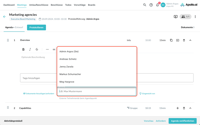 Als Gast können Sie entweder einen bestehenden Apollo.ai Anwender auswählen oder den Namen von einem externen Teilnehmer eintippen: