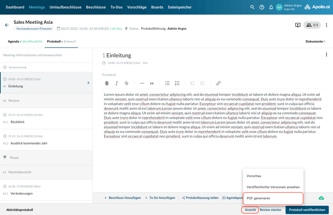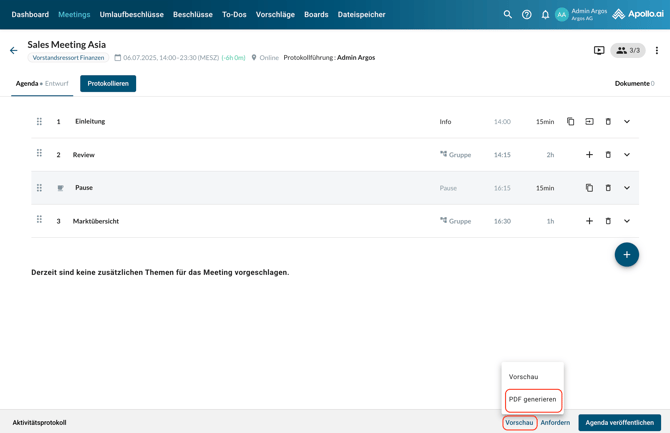 Um eine PDF-Datei der aktuellen Version der Agenda zu erstellen, klicken Sie im Agendabearbeitungsmodus auf „Vorschau“ und anschließend auf „PDF generieren“: