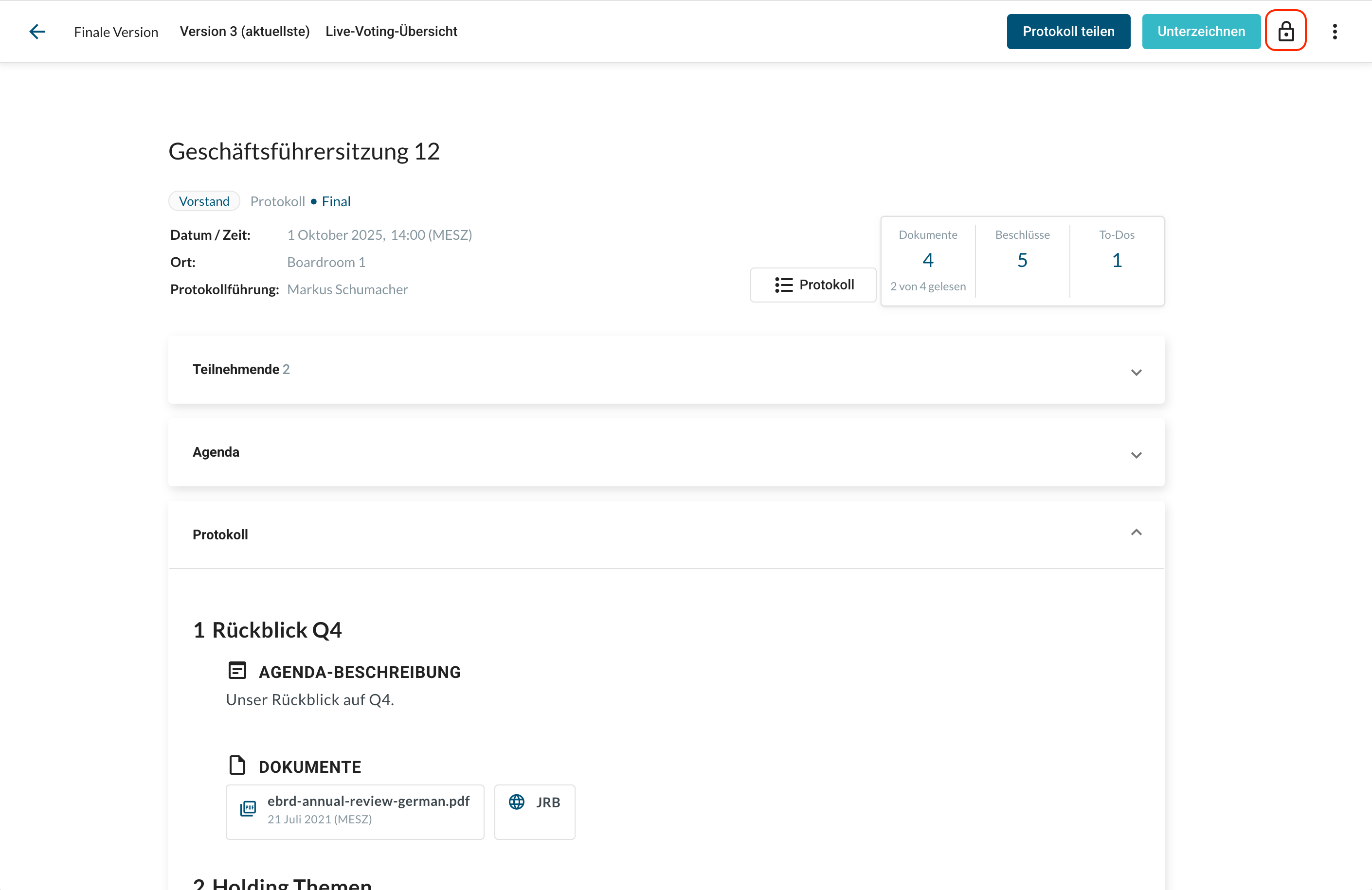 In Ausnahmefällen müssen Sie möglicherweise eine bereits abgeschlossene Sitzung wieder öffnen. Klicken Sie dazu einfach auf das Schloss-Symbol in der rechten oberen Ecke der abgeschlossenen Sitzung:
