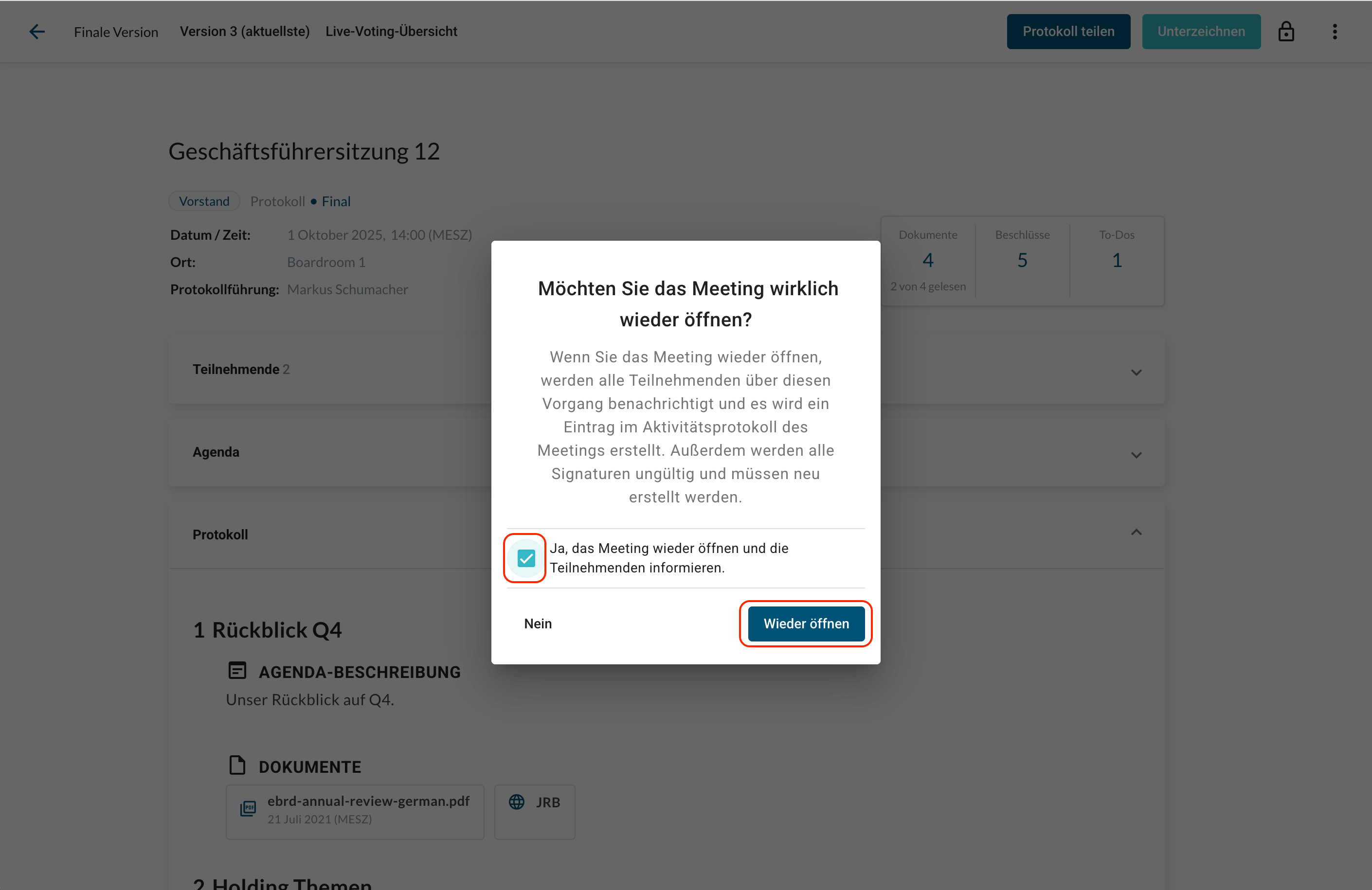 Wenn Sie die Sitzung wieder öffnen, werden alle Teilnehmenden über diese Aktion benachrichtigt und es wird ein Eintrag im Sitzungsaktivitätsprotokoll erstellt. Außerdem werden alle Unterschriften ungültig und müssen neu erstellt werden. Sie müssen Ihre Aktion bestätigen, um fortzufahren, und Sie können nicht fortfahren, ohne alle Teilnehmenden zu benachrichtigen: