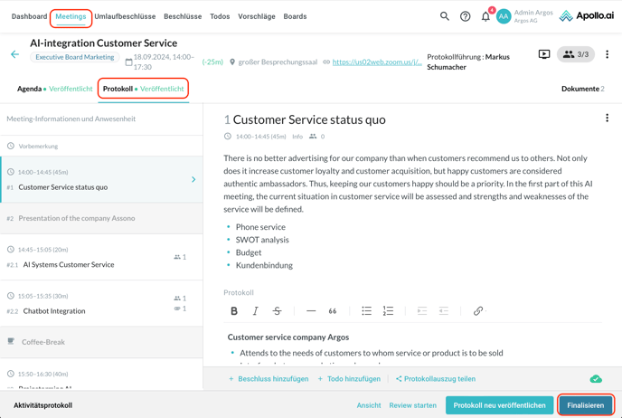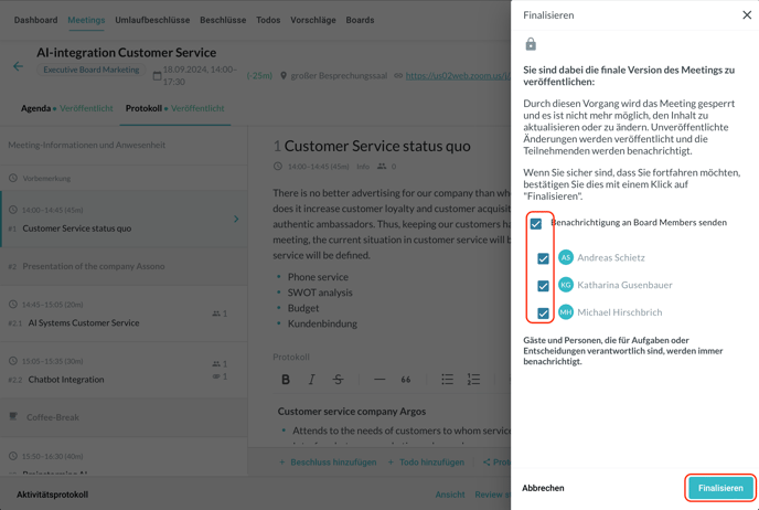 Wenn das Sitzungsprotokoll zur Fertigstellung bereit ist, kann dies durch Klicken auf „Finalisieren“ erfolgen: