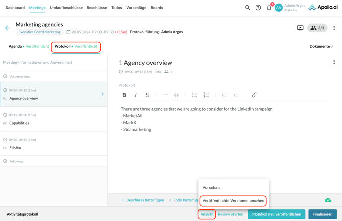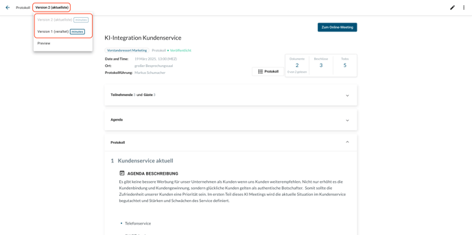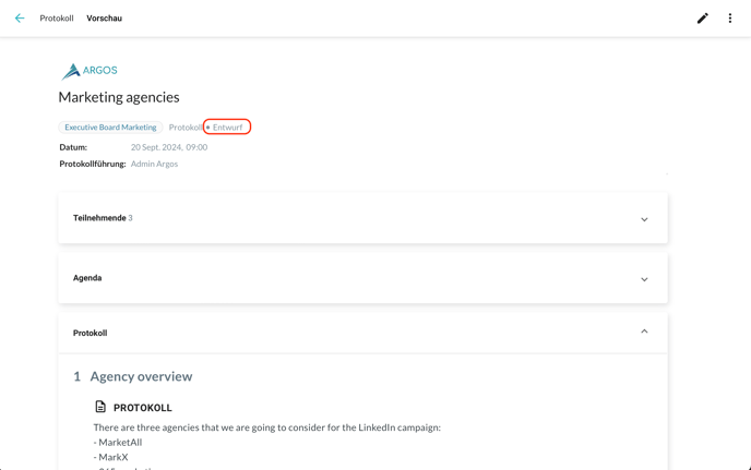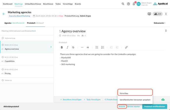 Über den Knopf unten rechts können Sie die Protokollvorschau öffnen, bevor die Minutes veröffentlicht werden. Klicken Sie dafür auf "Ansicht", dann auf "Vorschau":