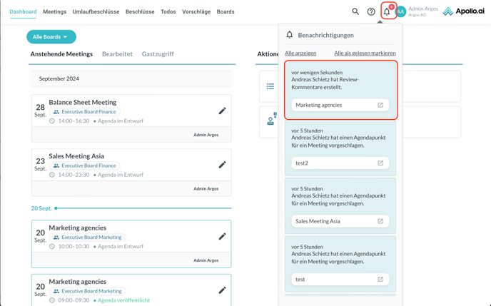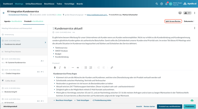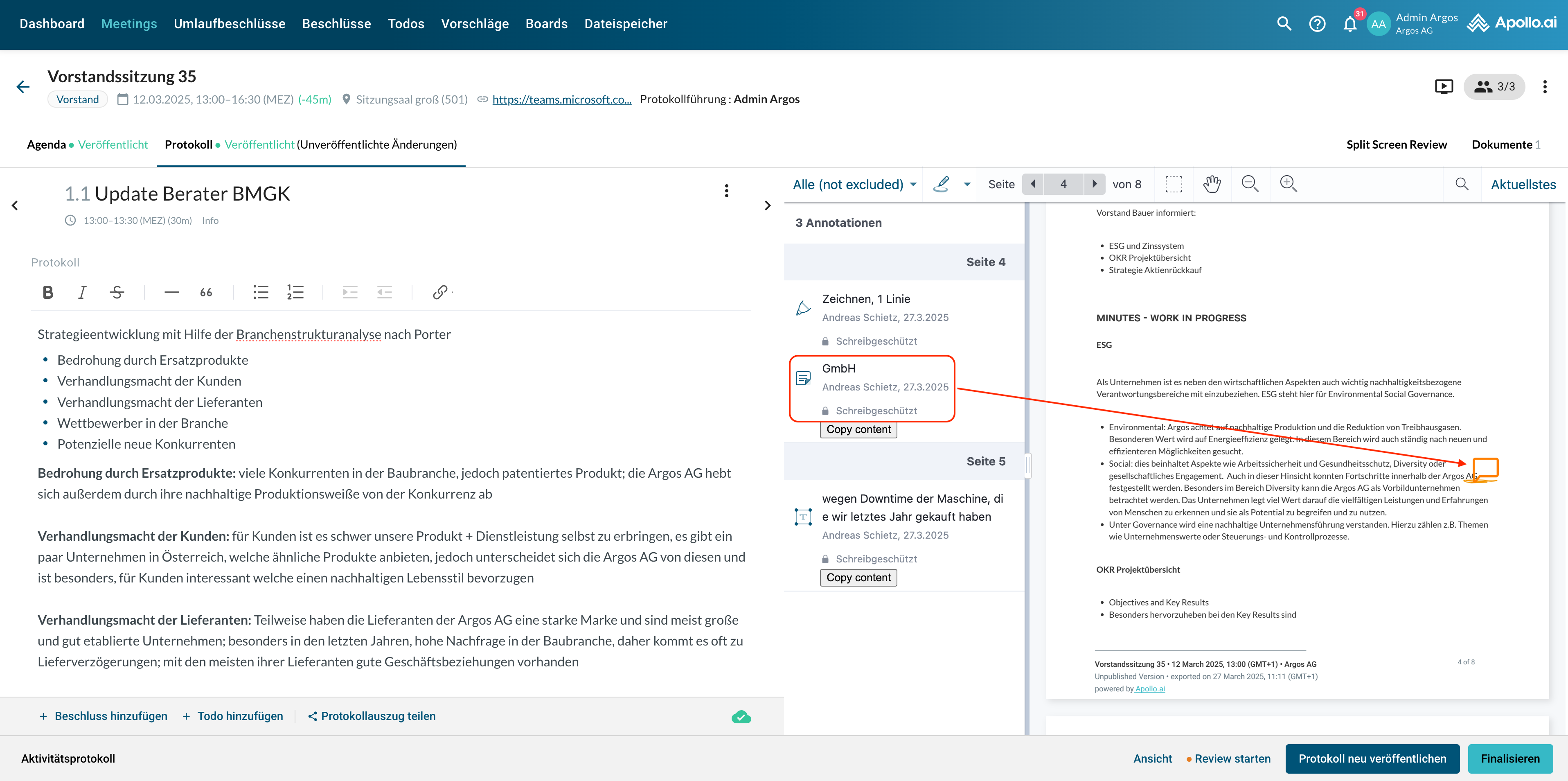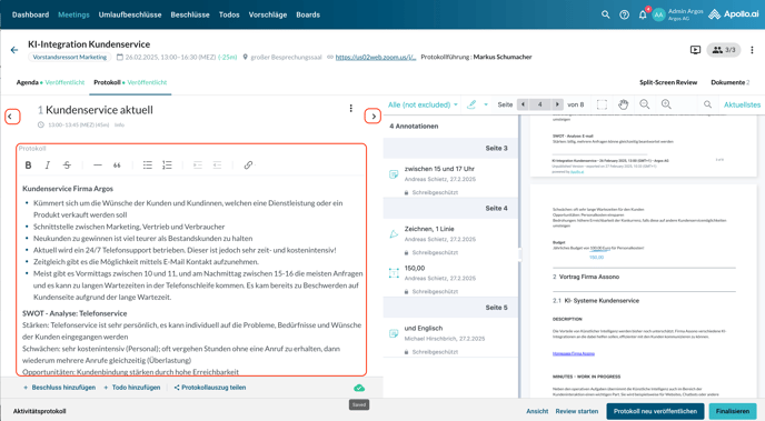 Wenn Sie auf die Benachrichtigung klicken, öffnet sich das Protokoll im Bearbeitungsmodus. Klicken Sie oben rechts auf „Split-Screen Review“, um die Kommentare der Board-Mitglieder anzuzeigen: