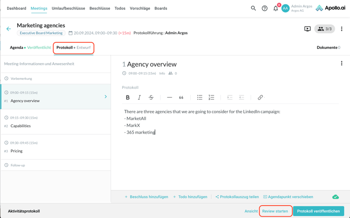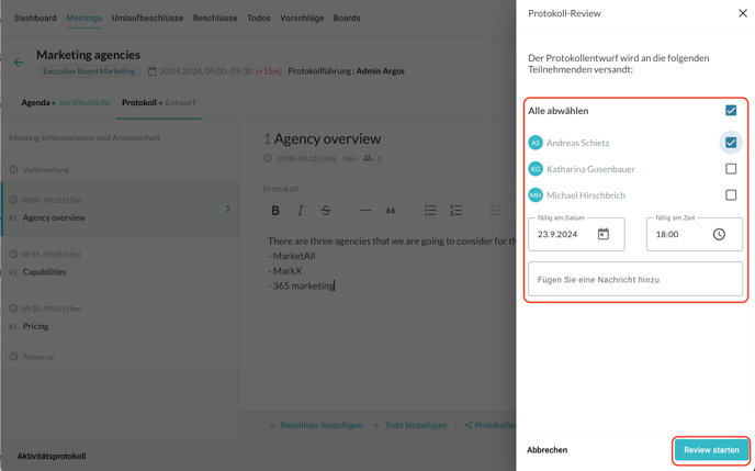 Wenn ein Protokoll erstellt wird, können Sie von Einzelpersonen eine Überprüfung verlangen. Der Vorgang wird durch das Klicken auf „Review starten“ im Protokoll gestartet: