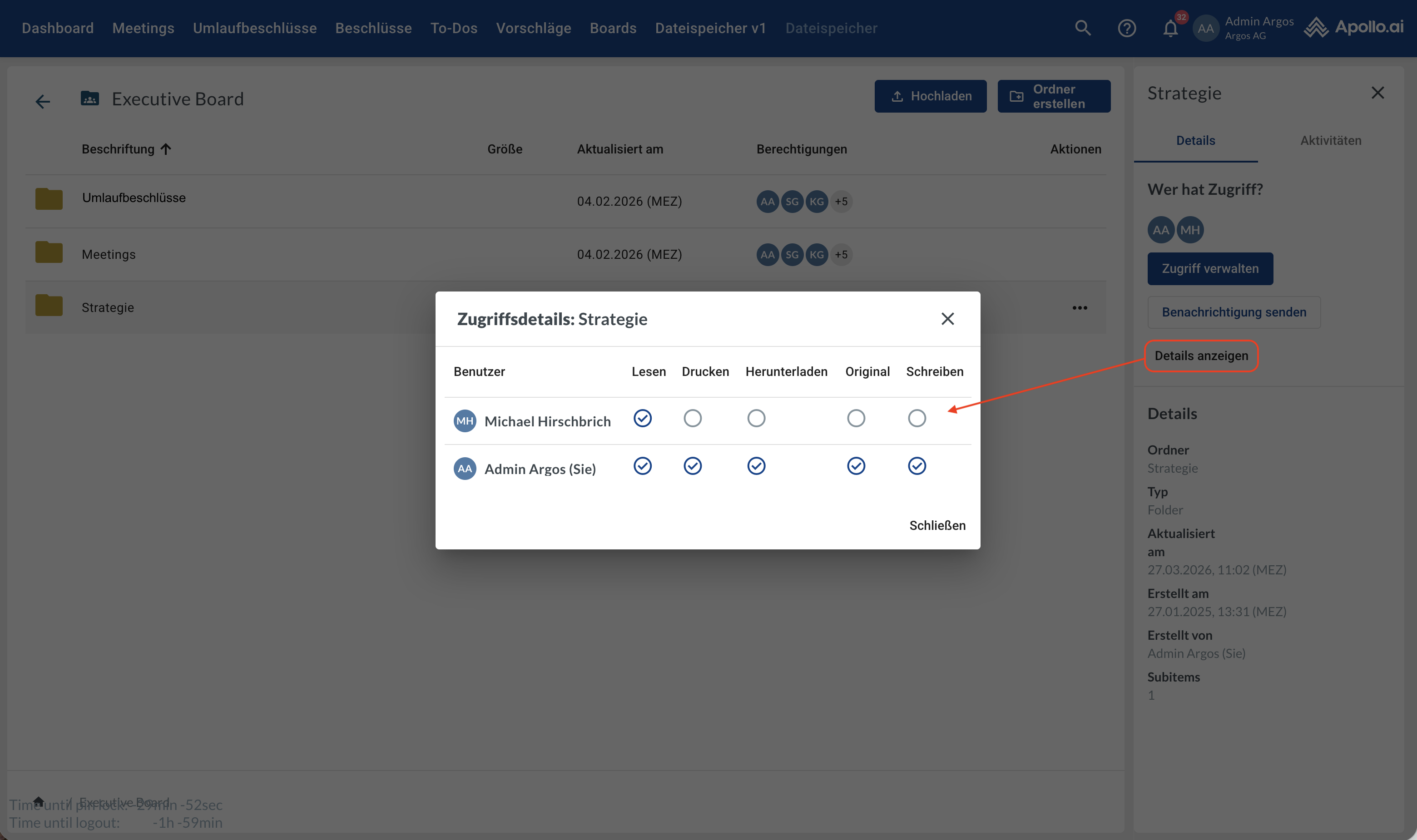 Wenn ein Element ausgewählt ist, klicken Sie in der Seitenleiste auf „Details anzeigen“, um die aktuellen Zugriffsrechte einzusehen: