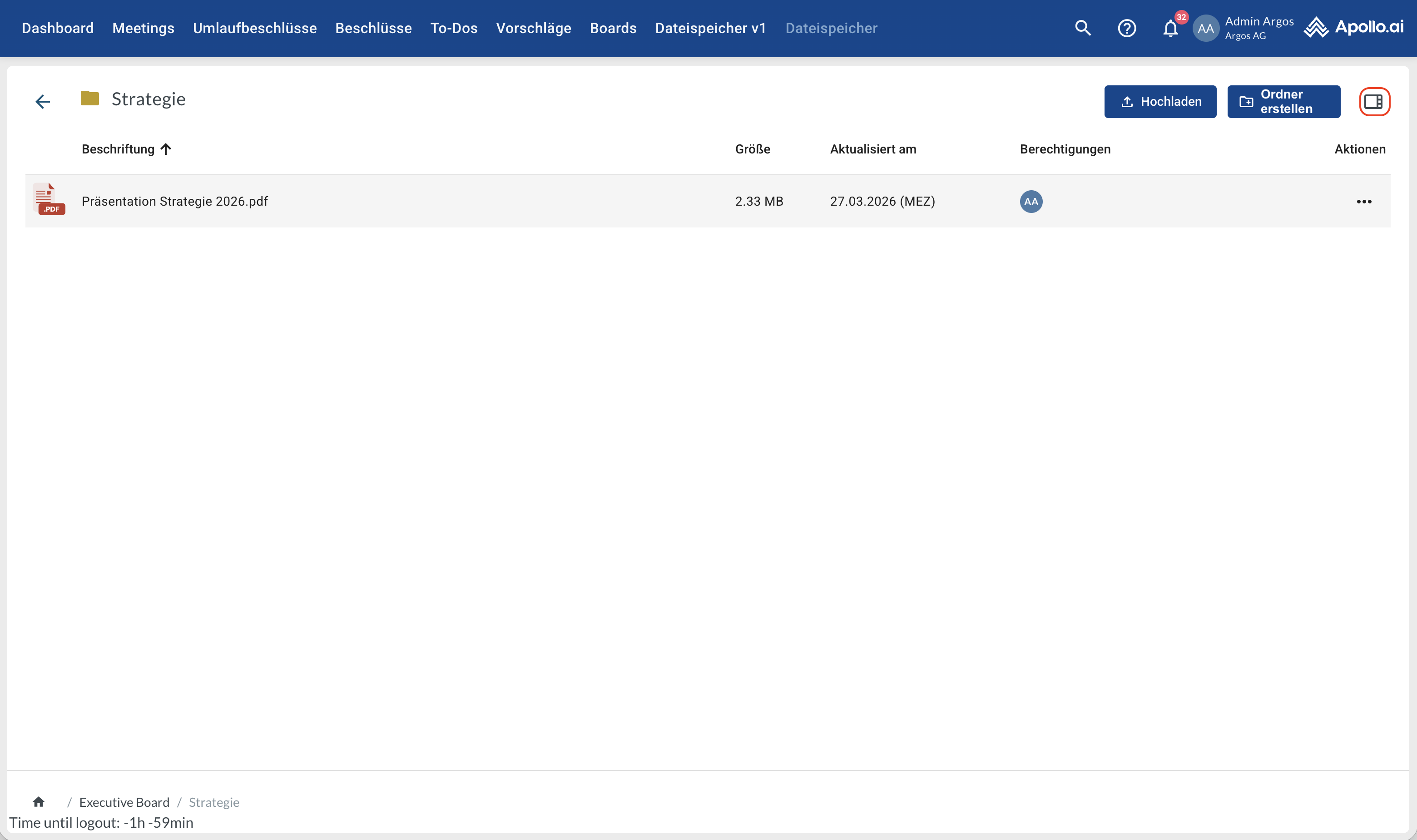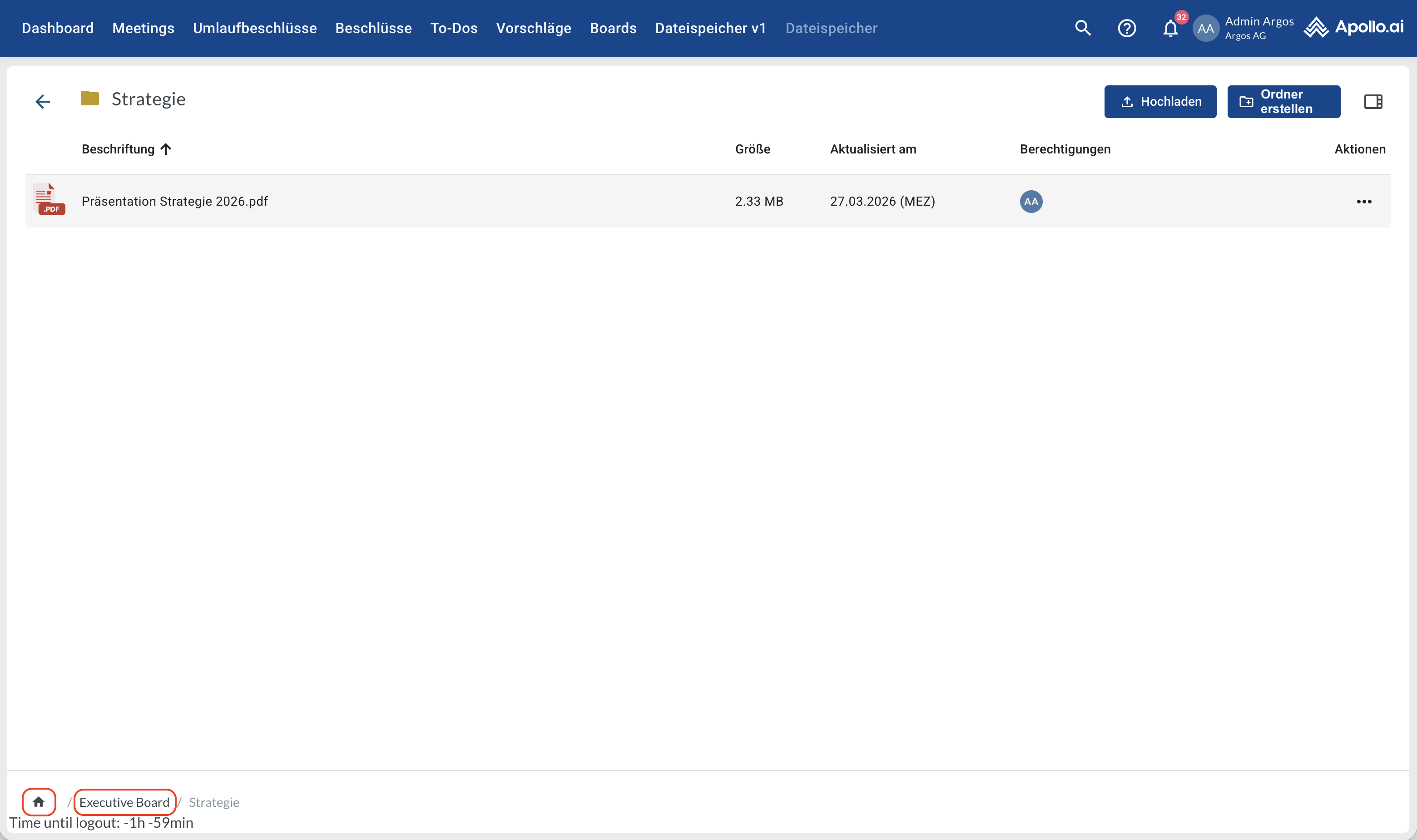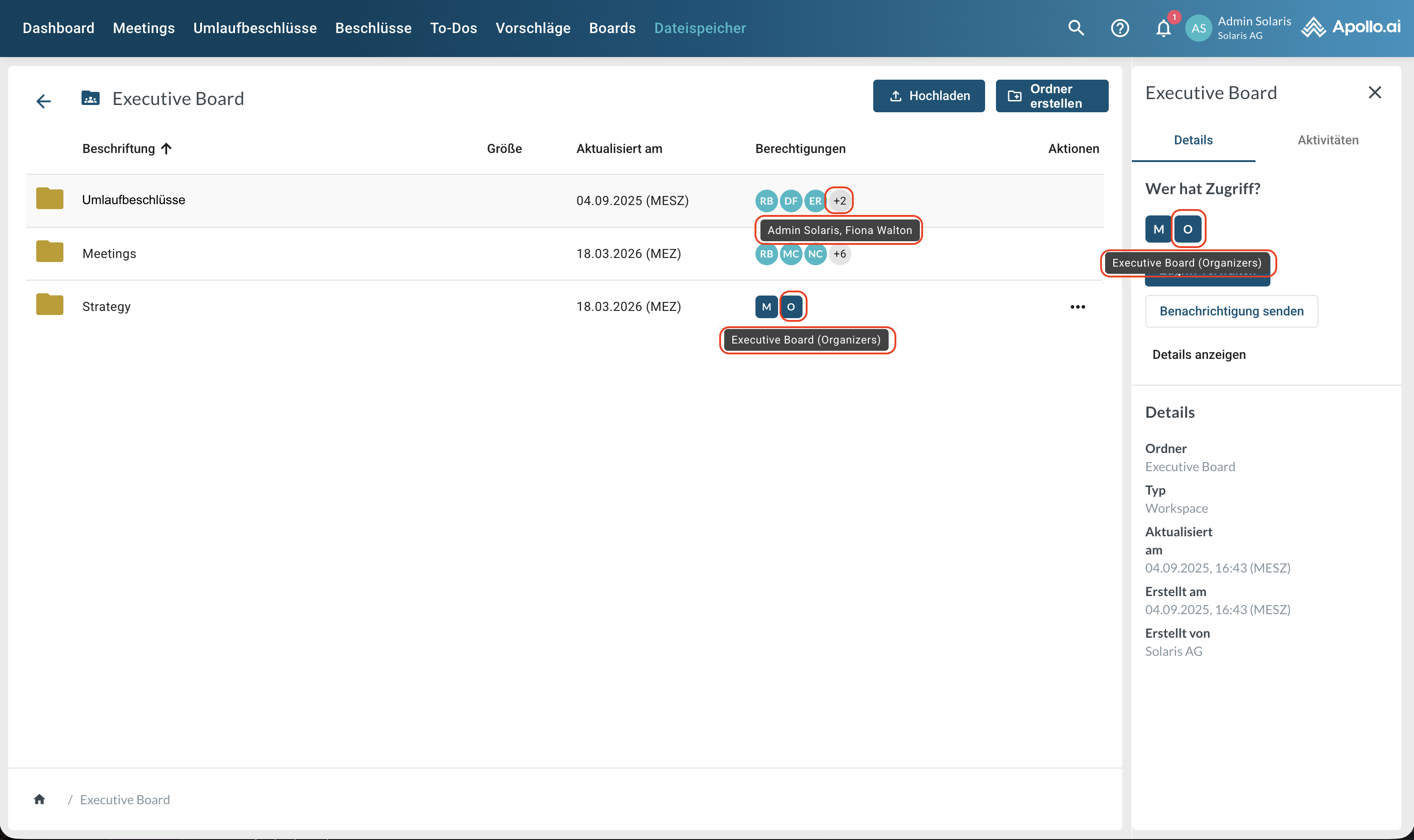 Öffnen Sie den gewünschten Board-Ordner (Doppelklick). Die Ordner „Meetings“ und „Umlaufbeschlüsse“ werden für jedes Board automatisch vom System erstellt und verwaltet. Sie enthalten die zugehörigen systemgenerierten PDFs sowie alle hochgeladenen Anhänge: