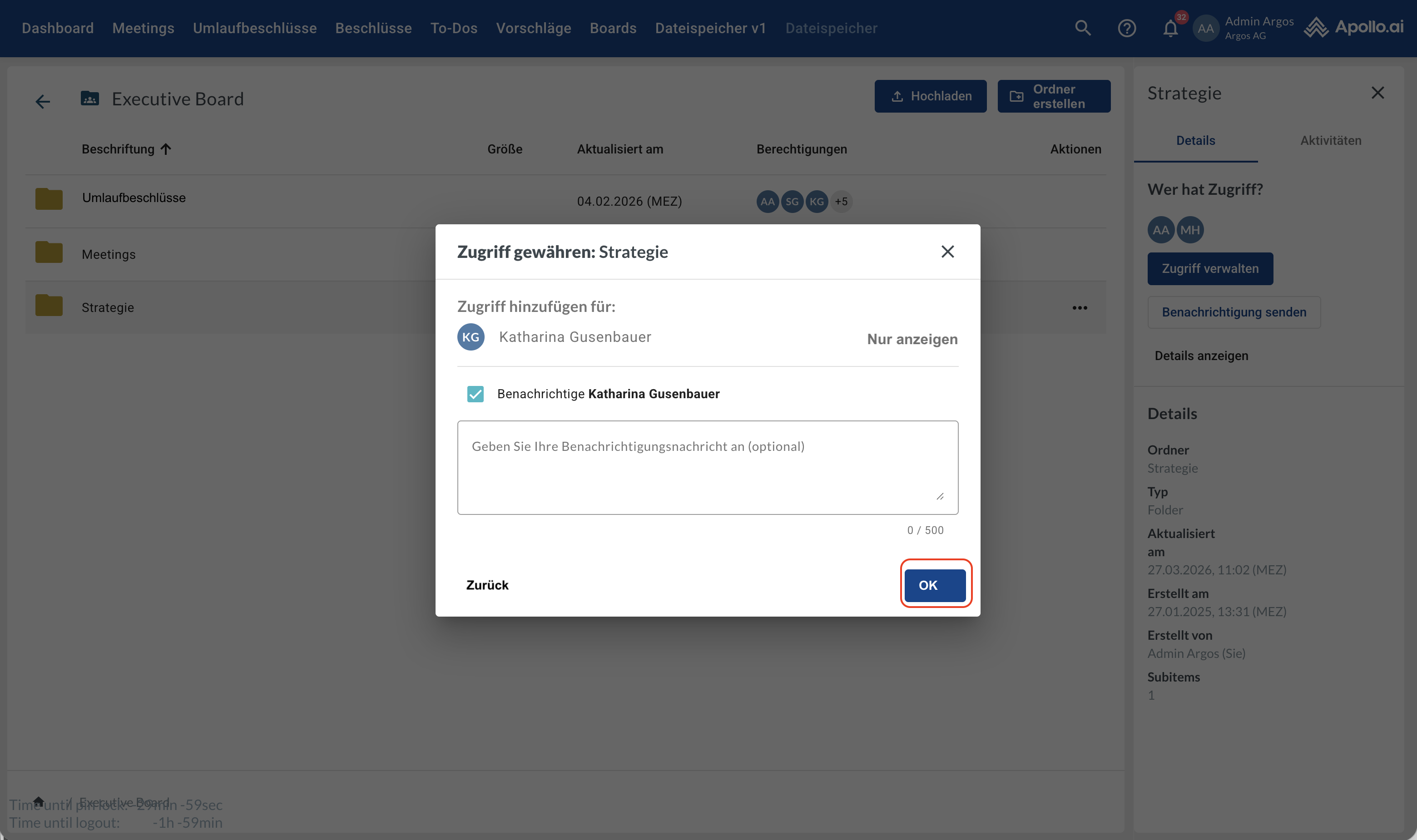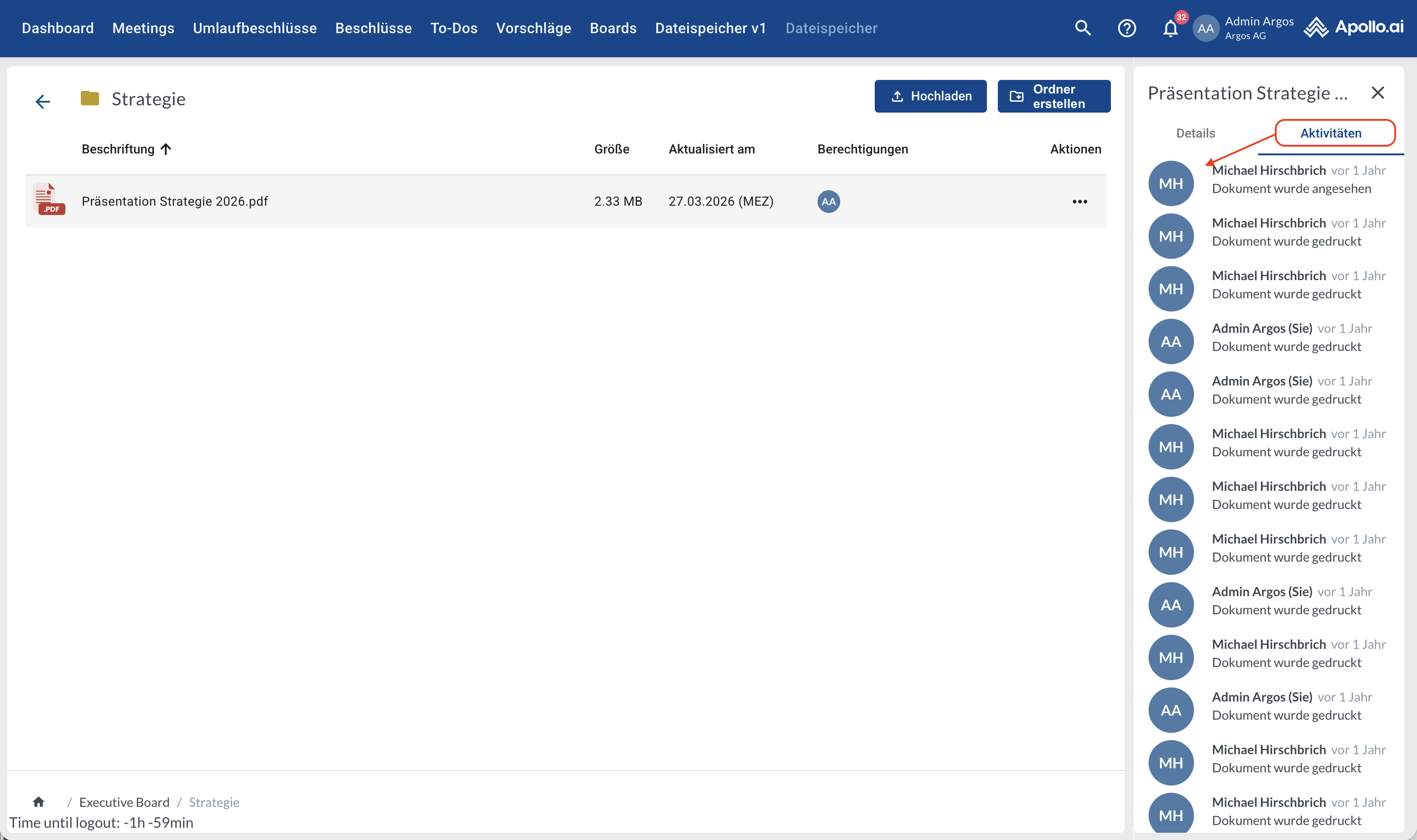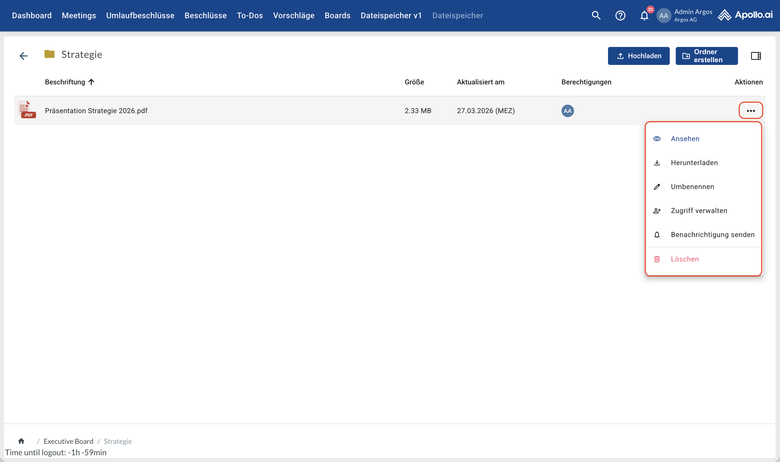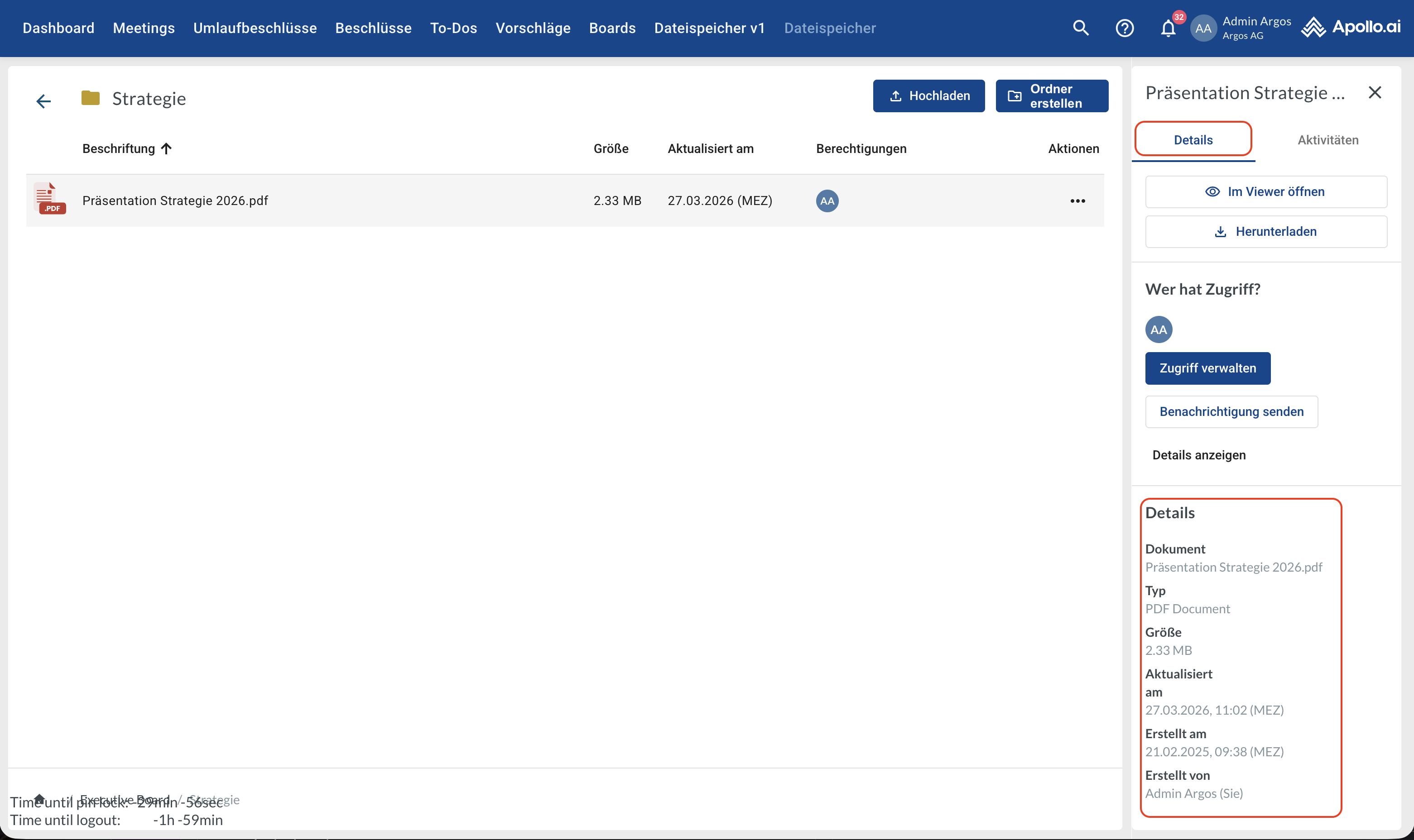 Öffnen Sie den gewünschten Board-Ordner (Doppelklick). Die Ordner „Meetings“ und „Umlaufbeschlüsse“ werden für jedes Board automatisch vom System erstellt und verwaltet. Sie enthalten die zugehörigen systemgenerierten PDFs sowie alle hochgeladenen Anhänge: