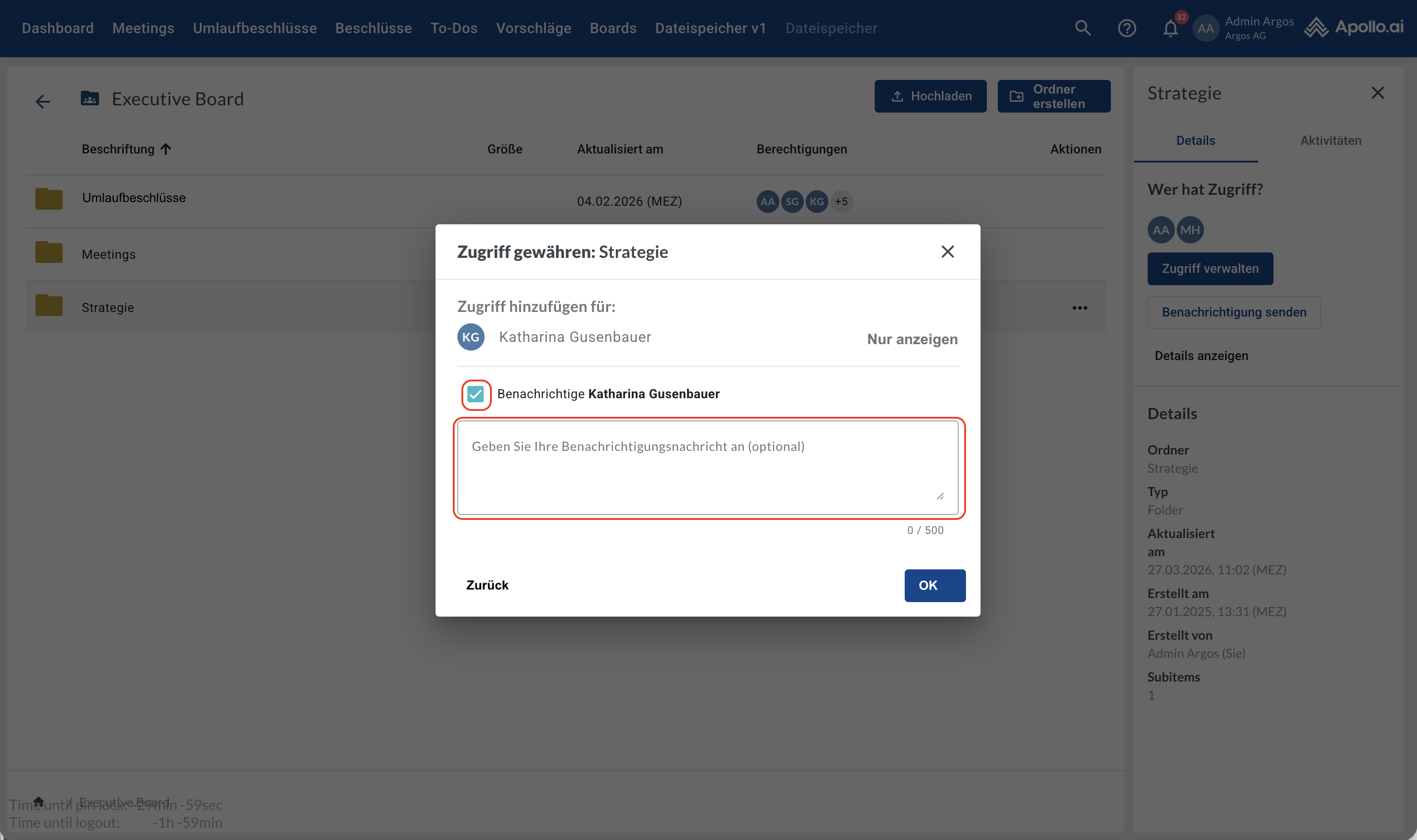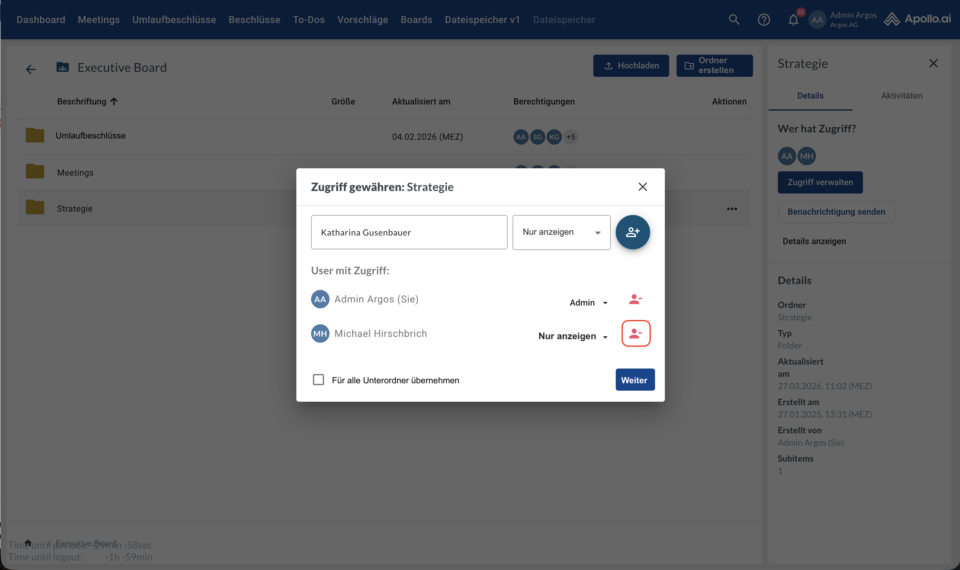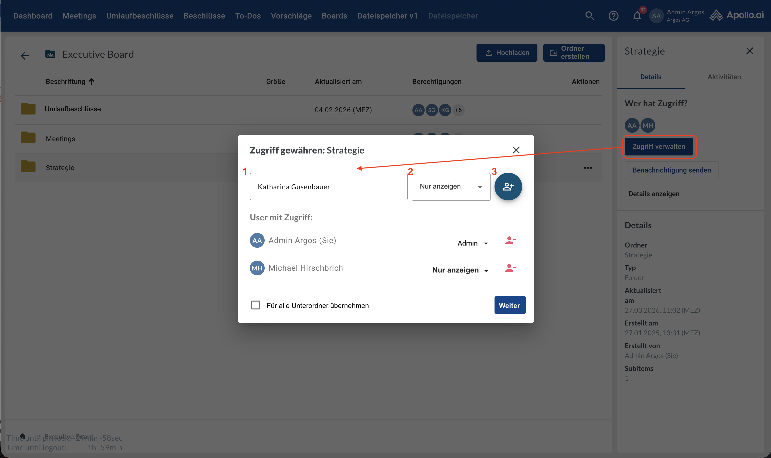 Hinweis: Um einen Benutzer zu einer Datei oder einem Ordner hinzufügen zu können, muss dieser zuvor auf Board-Ebene (Board-Ordner) dem entsprechenden übergeordneten Ordner hinzugefügt worden sein.