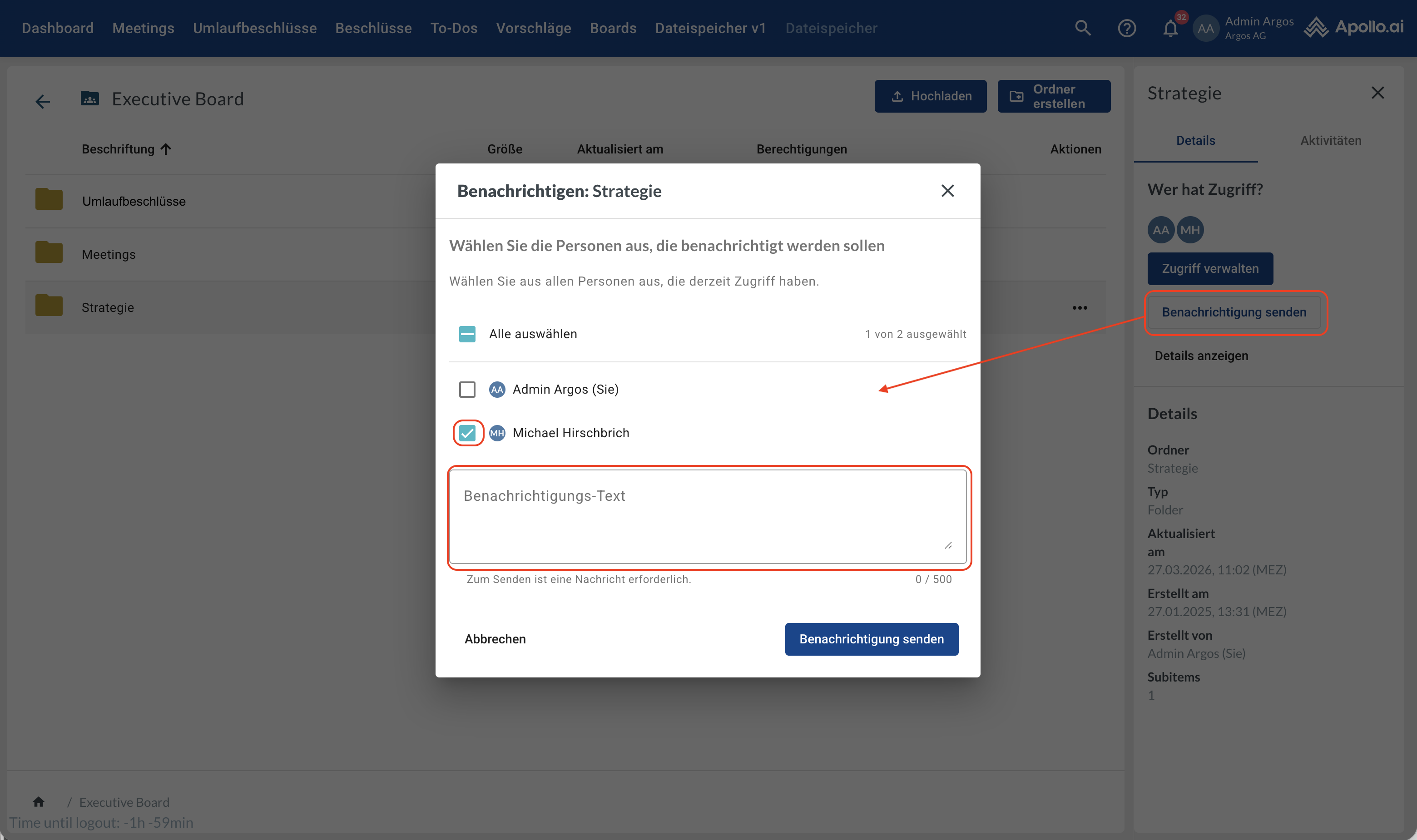 Wenn ein Element ausgewählt ist, klicken Sie in der Seitenleiste auf „Benachrichtigung senden“, um einen Link zum Element an einen oder mehrere Benutzer zu senden, die bereits Zugriff darauf haben. Wählen Sie den gewünschten Benutzer aus und fügen Sie eine Nachricht hinzu: