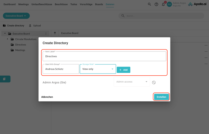 Wenn Sie einen neuen Ordner erstellen, brauchen Sie zuerst den Namen angeben, dann können Sie alle Benutzer hinzufügen, die Zugriff erhalten sollen und deren Berechtigungen auswählen. Klicken Sie für jeden neuen User auf "Hinzufügen". Der Ersteller des Ordners wird automatisch als Admin eingestellt. Klicken Sie unten rechts auf "Erstellen", um den Vorgang zu bestätigen: