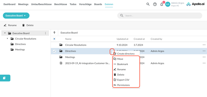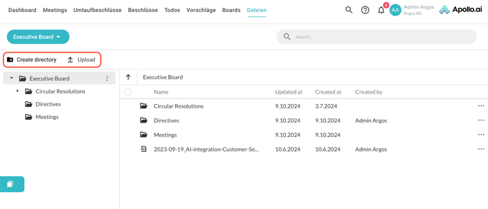 Oben links können Sie nach Board filtern. Die Ordner 'Meetings' und 'Umlaufbeschlüsse' werden für jedes Board vom System automatisch erstellt und gepflegt; Alle Anhänge sind auch enthalten: