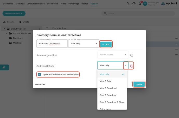 Wenn Sie auf "Berechtigungen" klicken, können Sie einen neuen User hinzufügen, einen bestehenden löschen oder deren Zugriffsrechte ändern. Sie können auch auswählen, ob die neuen Einstellungen für alle Unterordner und dazugehörigen Dateien gelten sollen. Klicken Sie danach auf "Aktualisieren", um den Vorgang zu bestätigen:
