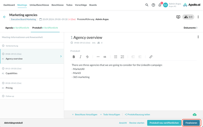 Das Protokoll abschließen und von den Board Members signieren lassen