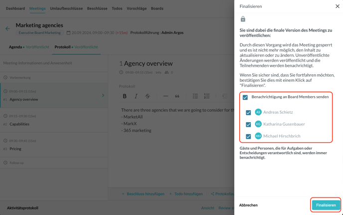 Entscheiden Sie, ob die Board Members eine E-Mail-Benachrichtigung erhalten sollen, dann klicken Sie unten rechts auf "Finalisieren":