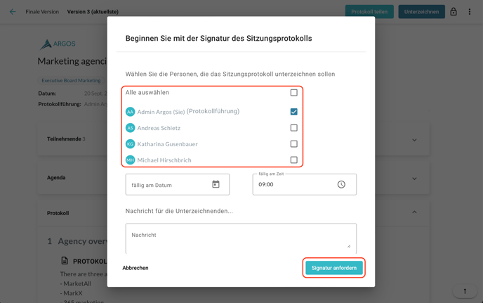 Als nächstes erscheint eine Liste aller Vorstandsmitglieder. Sie können auswählen, wer die Sitzung unterzeichnen soll. Definieren Sie dann eine Frist, fügen Sie bei Bedarf eine Nachricht hinzu und klicken Sie anschließend unten rechts auf „Signatur anfordern“:
