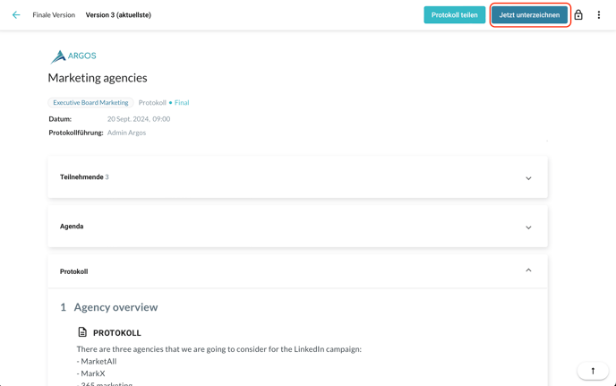 Beim Abschluss eines Meetings und der Veröffentlichung der endgültigen Version haben Sie die Möglichkeit, die Teilnehmer um eine Unterschrift zu bitten. Klicken Sie dazu auf die Schaltfläche „Unterzeichnen“ oben rechts:
