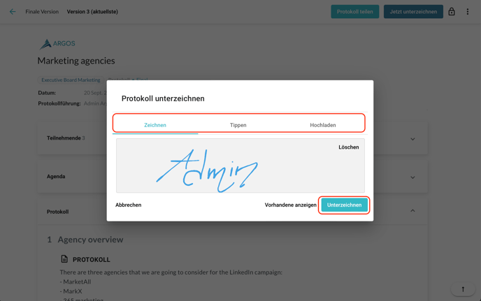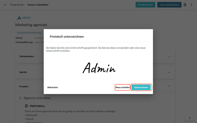 Jeder ausgewählte Teilnehmer erhält eine E-Mail zur Unterschrift der Besprechung und kann das Dokument beim Einloggen in das System ganz einfach unterzeichnen. Die Assistenz kann als Protokollführung selbst auch eine Unterschrift abgeben: