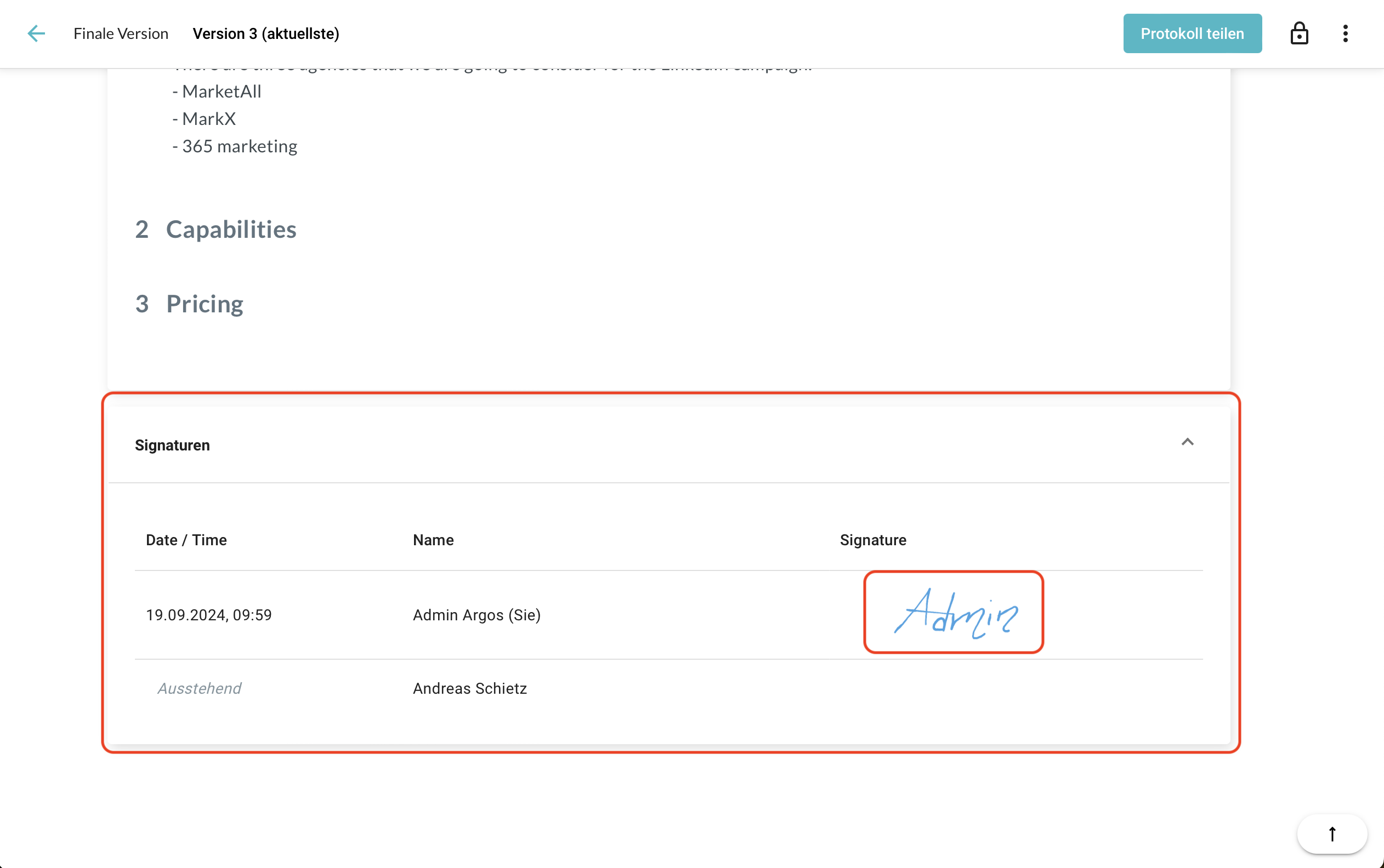Nachdem die Signatur erfolgt ist, kann jeder Leser diese im System unter dem Protokoll sehen: